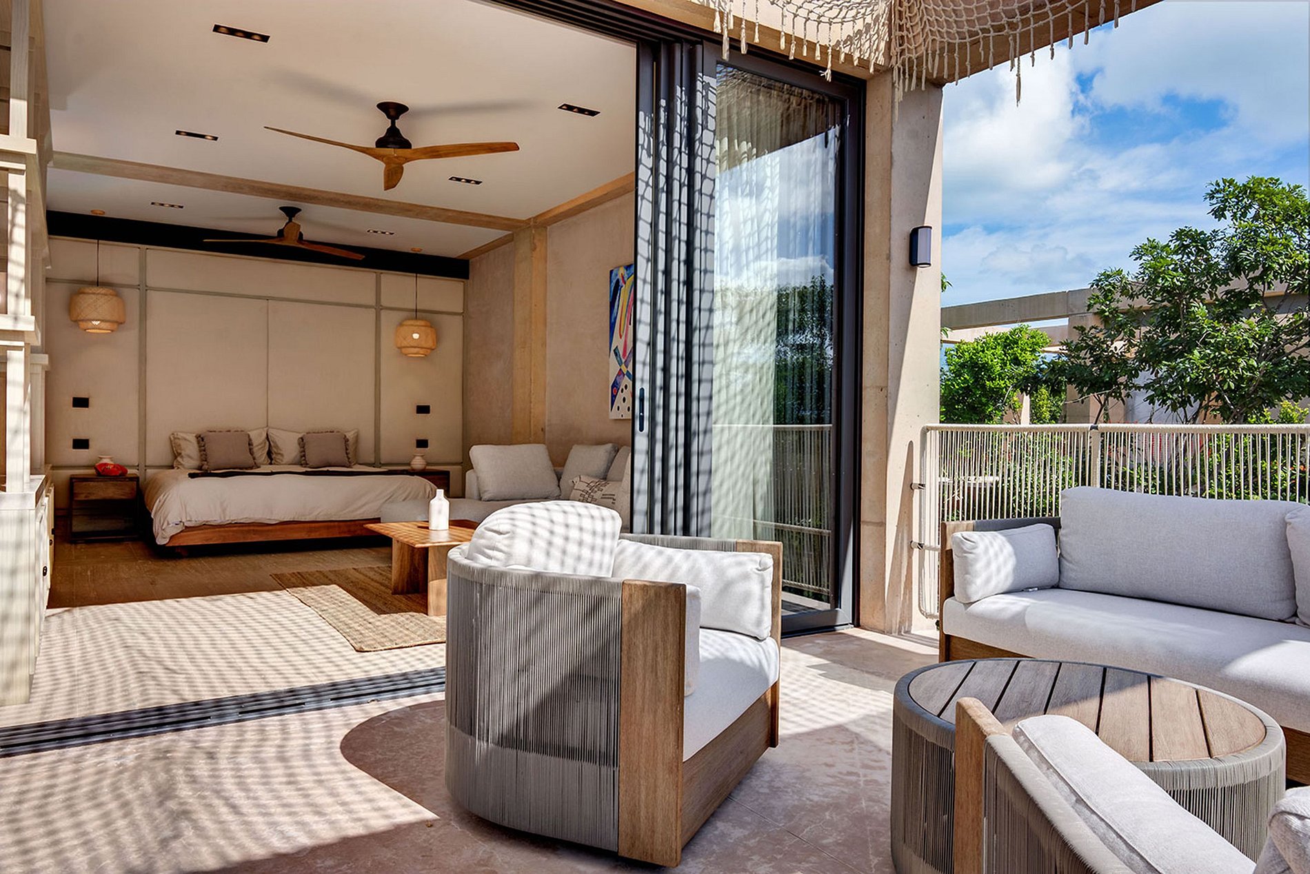 O quarto principal possui uma cama king size, acesso direto ao terraço compartilhado, ar condicionado, roupões Lacoste, ventilador de teto, banheiro privativo com chuveiro, vista para a piscina e jardim, produtos de higiene pessoal, TV, acesso Wi-Fi, e telas de janela.