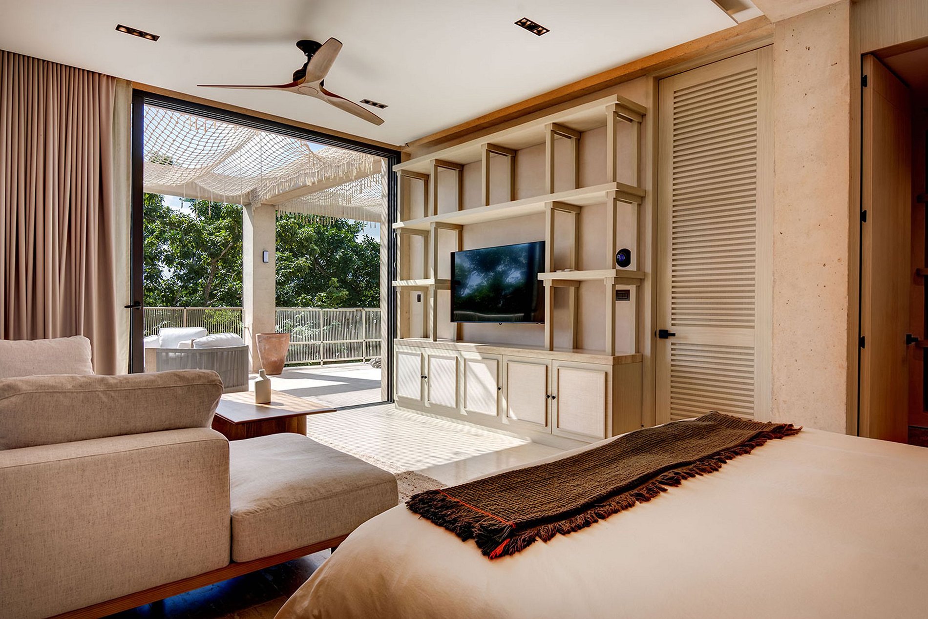 O quarto principal possui uma cama king size, acesso direto ao terraço compartilhado, ar condicionado, roupões Lacoste, ventilador de teto, banheiro privativo com chuveiro, vista para a piscina e jardim, produtos de higiene pessoal, TV, acesso Wi-Fi, e telas de janela.