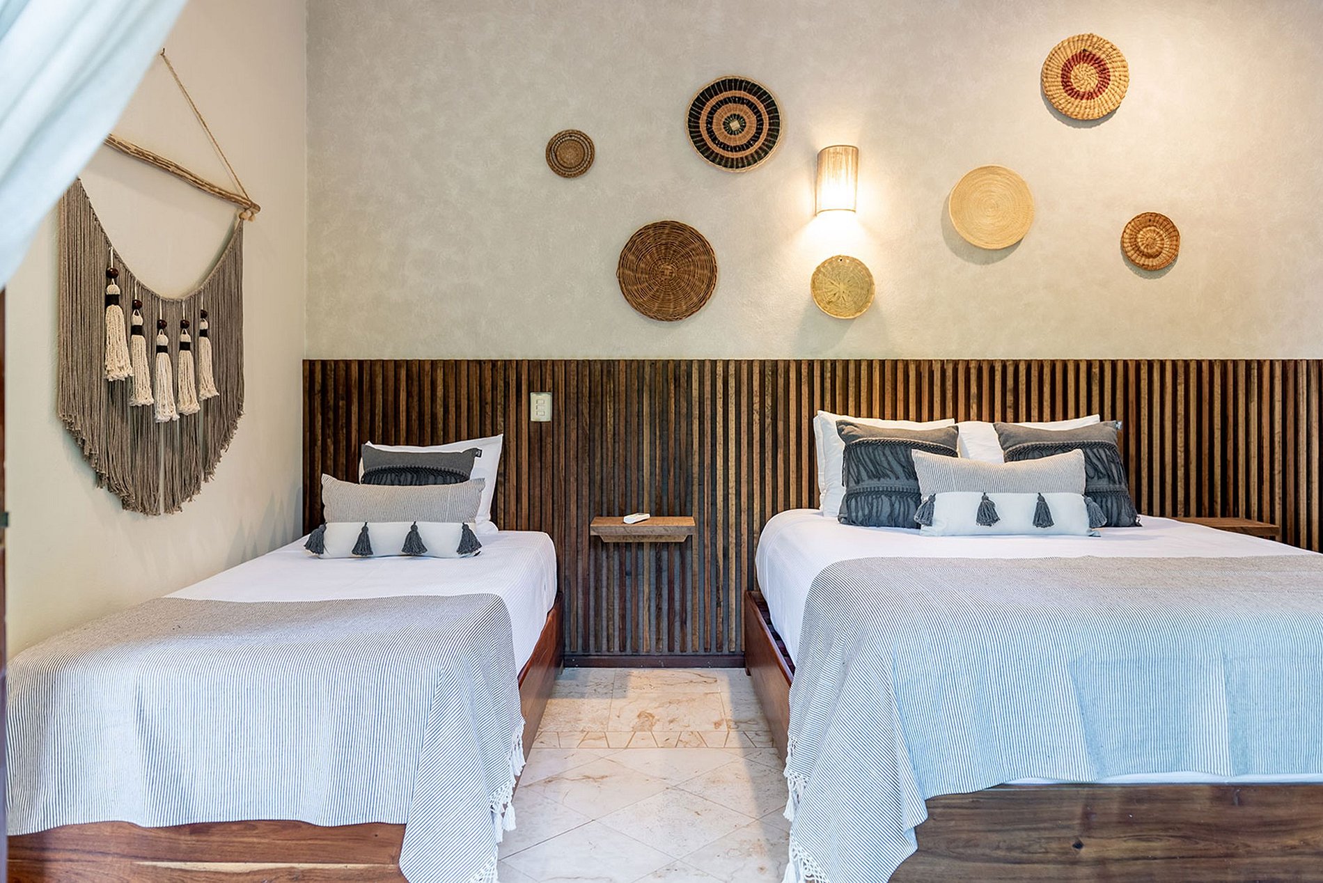 MISTRAL: Prepare-se para ser cativado pela beleza panorâmica do segundo nível. O MISTRAL engloba generosos espaços comuns, uma sala de estar exterior com terraços cobertos, e serve de ponto de encontro para todo o grupo. Inclui dois quartos amplos com ar-condicionado e banheiro privativo. O quarto virado para o mar possui uma cama king-size, enquanto o outro quarto oferece uma cama queen-size e um terraço privado virado para o jardim tropical. Estas acomodações podem acomodar de 2 a 5 pessoas, permitindo que você relaxe em confortáveis espreguiçadeiras ao ar livre e saboreie a suave brisa do mar.