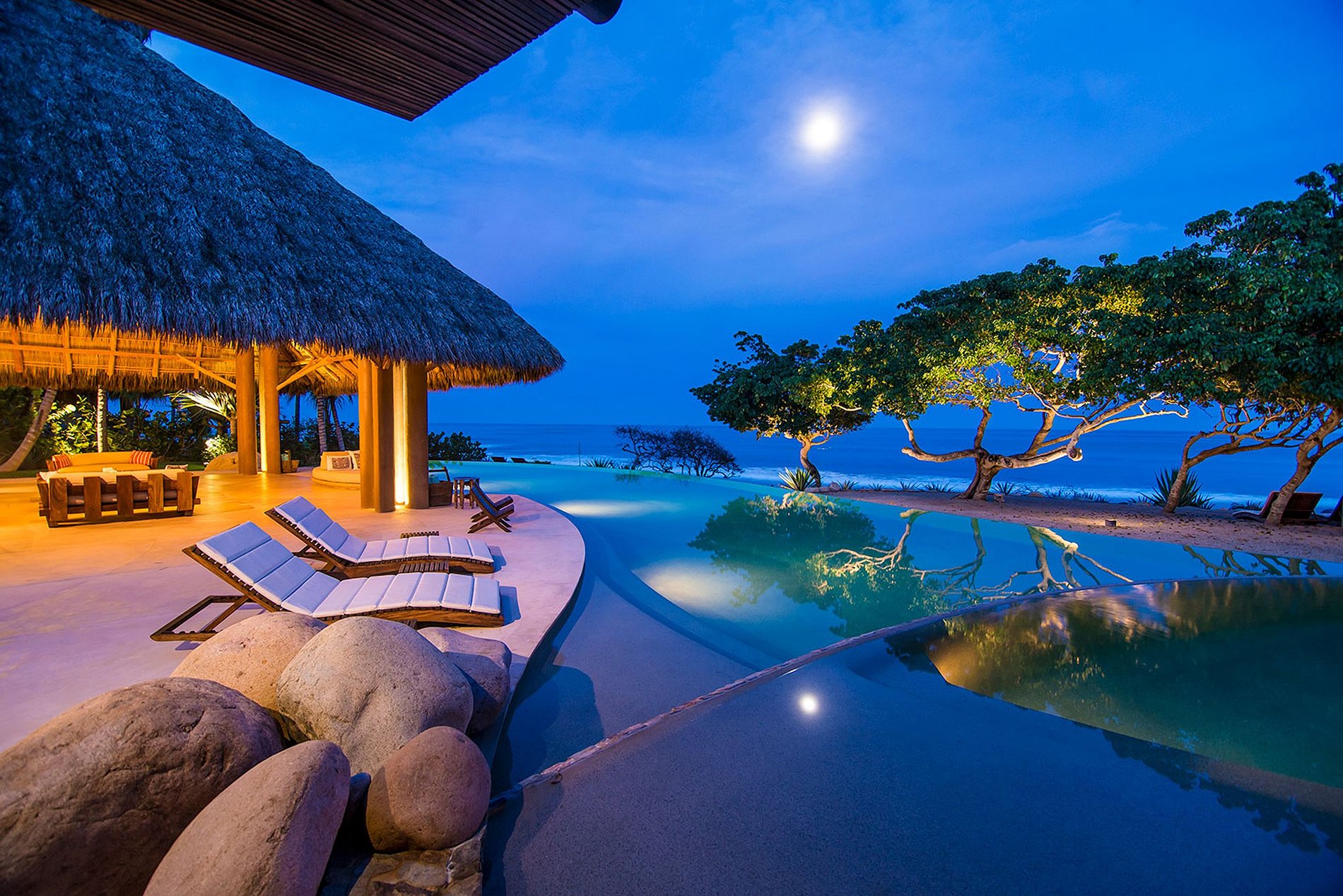 Duas piscinas espelham o fascínio tranquilo do mar e do céu, suas bordas infinitas se fundindo perfeitamente com o oceano para criar um vínculo tangível com o meio ambiente. O ritmo suave, talvez emprestado das ondas, ressoa em toda a residência, desde o tranquilo santuário de ioga até o grande palapa de jantar.