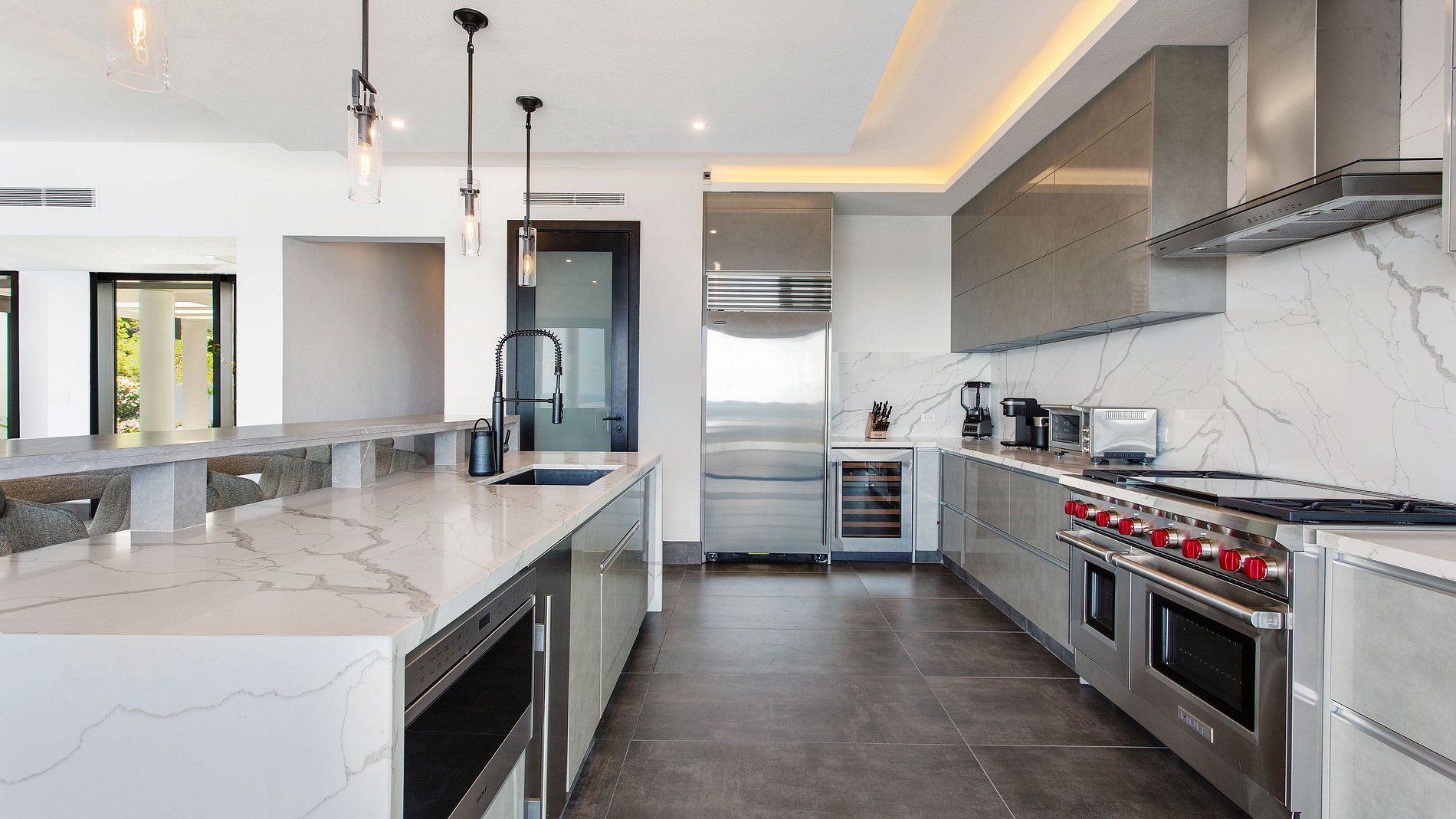 A sala de estar é ampla e acolhedora, com sofás grandes e vista desobstruída da piscina e do oceano. Ao lado, há uma cozinha moderna totalmente equipada e uma sala de jantar interna. A propriedade inclui também área de churrasco, cozinha externa, smart TVs, canais a cabo, adega e Wi-Fi de alta velocidade. Os serviços incluem limpeza diária (exceto aos domingos e feriados), coquetel de boas-vindas na chegada e traslado de cortesia do aeroporto ou porto.