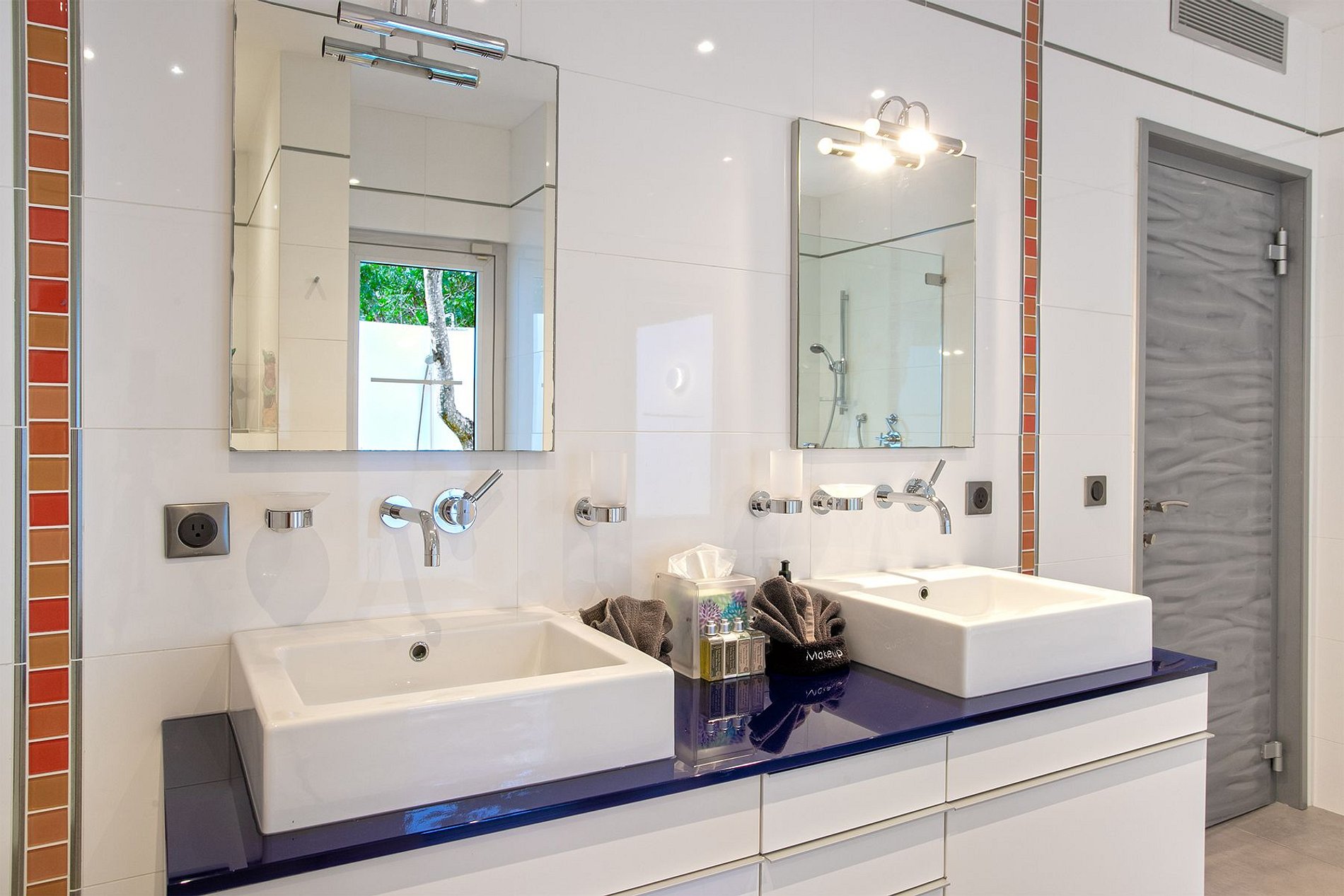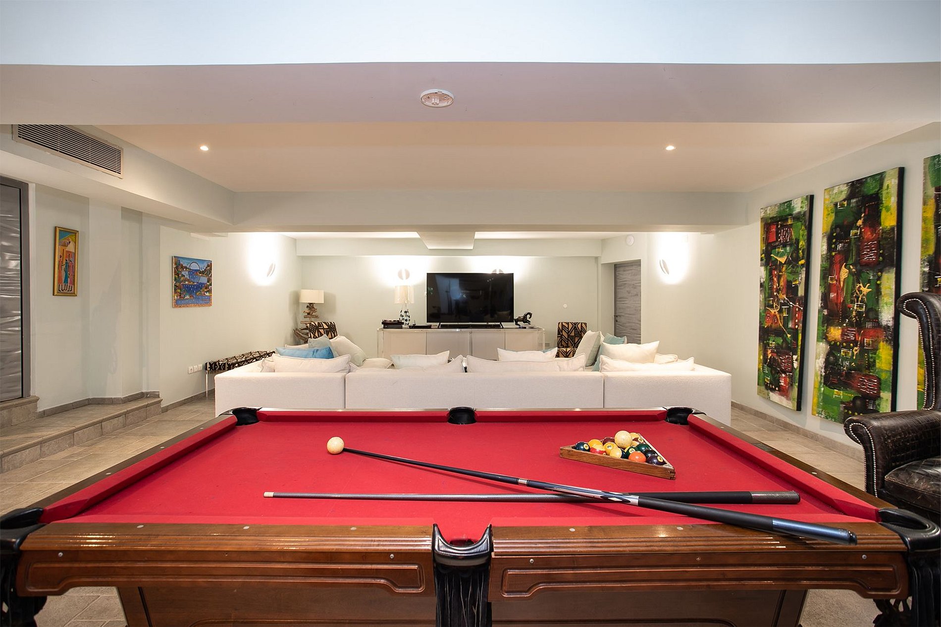 Os interiores da villa combinam conforto e elegância com vistas panorâmicas para o mar em praticamente todos os ambientes. As áreas sociais integradas se conectam à cozinha gourmet totalmente equipada. Os hóspedes podem relaxar na sala de cinema privativa, jogar bilhar ou aproveitar o som do mar em cabanas sombreadas e no terraço espaçoso à beira-mar.