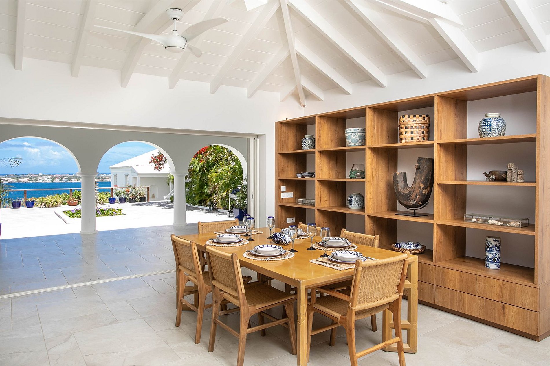A entrada ladeada por vegetação leva à casa principal, onde o piso de pedra calcária, o pé-direito alto e as venezianas criam um espaço arejado e acolhedor. O terraço oferece área de estar, sala de jantar externa e vista aberta para Anguilla. Ao lado, uma casa de piscina com bar, banheiro e sistema de som é ideal para aproveitar o pôr do sol. A cozinha conta com armários de madeira clara, eletrodomésticos Bosch e Siemens e se conecta com um gazebo para café da manhã com vista para o mar. Os cinco quartos, todos com banheiro privativo, ar-condicionado e Smart TV, estão localizados em diferentes níveis do terreno, oferecendo privacidade total. A nova suíte master inclui terraço com vista para a lagoa, banheiro com chuveiro de vidro, bidê e pias duplas. Uma ótima opção para grupos de amigos ou famílias com filhos mais velhos que buscam tranquilidade, natureza e fácil acesso às atrações da ilha.