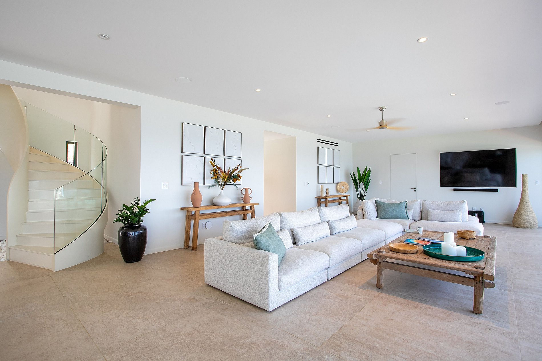 Os seis quartos estão distribuídos por três andares e todos incluem banheiros privativos, duchas estilo walk-in, ar-condicionado e acesso direto às áreas externas. A suíte master também conta com banheira e uma vista incrível para o mar. A vila combina privacidade, conforto moderno e comodidades de alto padrão em um dos recantos mais tranquilos da ilha.