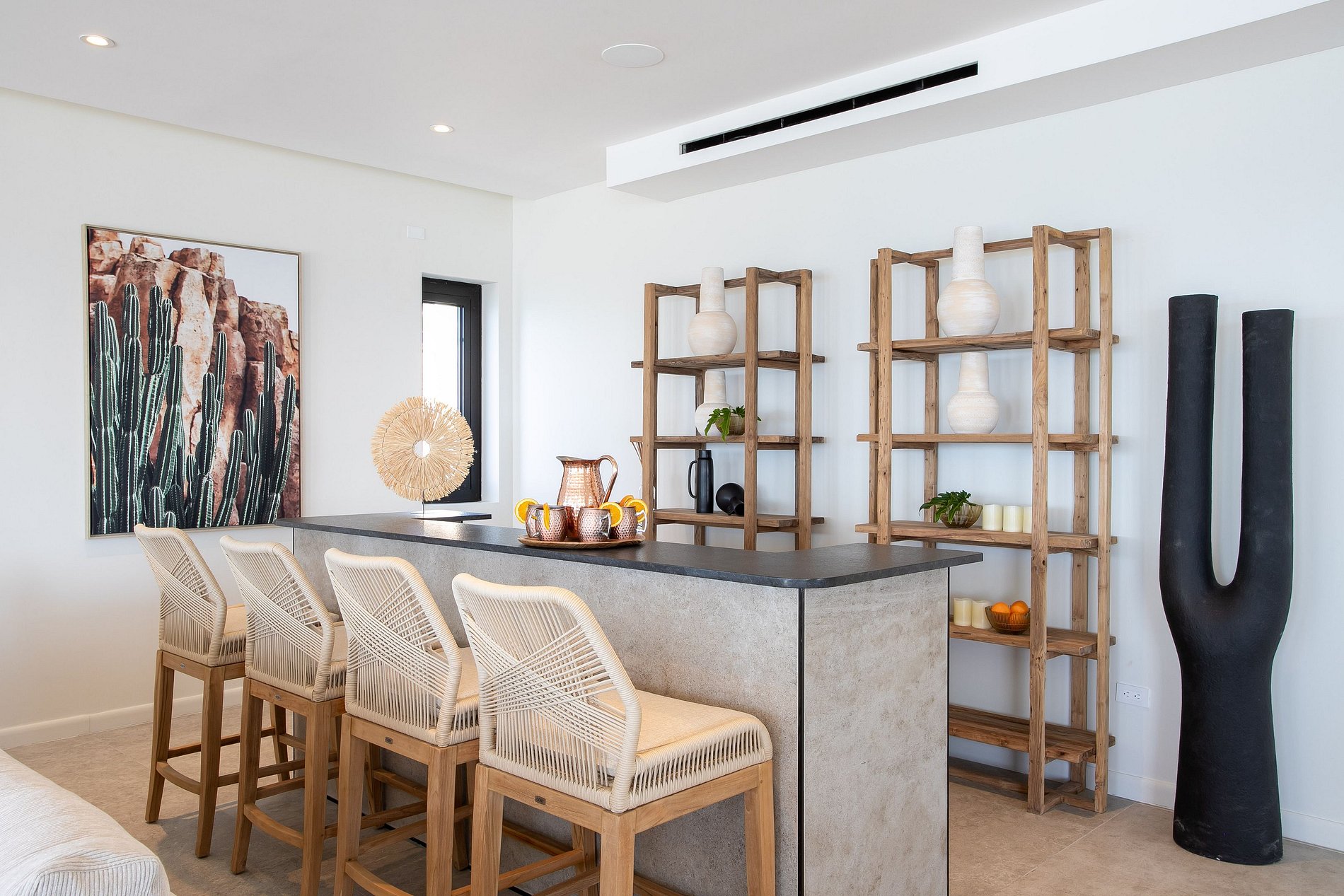 A casa apresenta linhas modernas, tons neutros e decoração minimalista, transmitindo uma atmosfera de sofisticação tranquila. O andar principal inclui uma sala ampla, cozinha de última geração com ilha central e uma sala de jantar ideal para receber. O terraço ao ar livre convida ao relaxamento ao sol ou a um jantar ao ar livre junto à piscina infinita, com pôr do sol espetacular sobre o mar do Caribe.