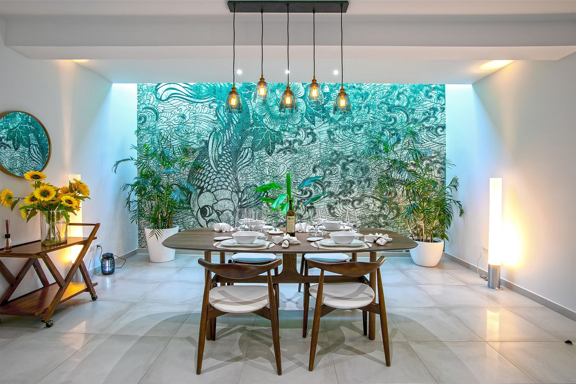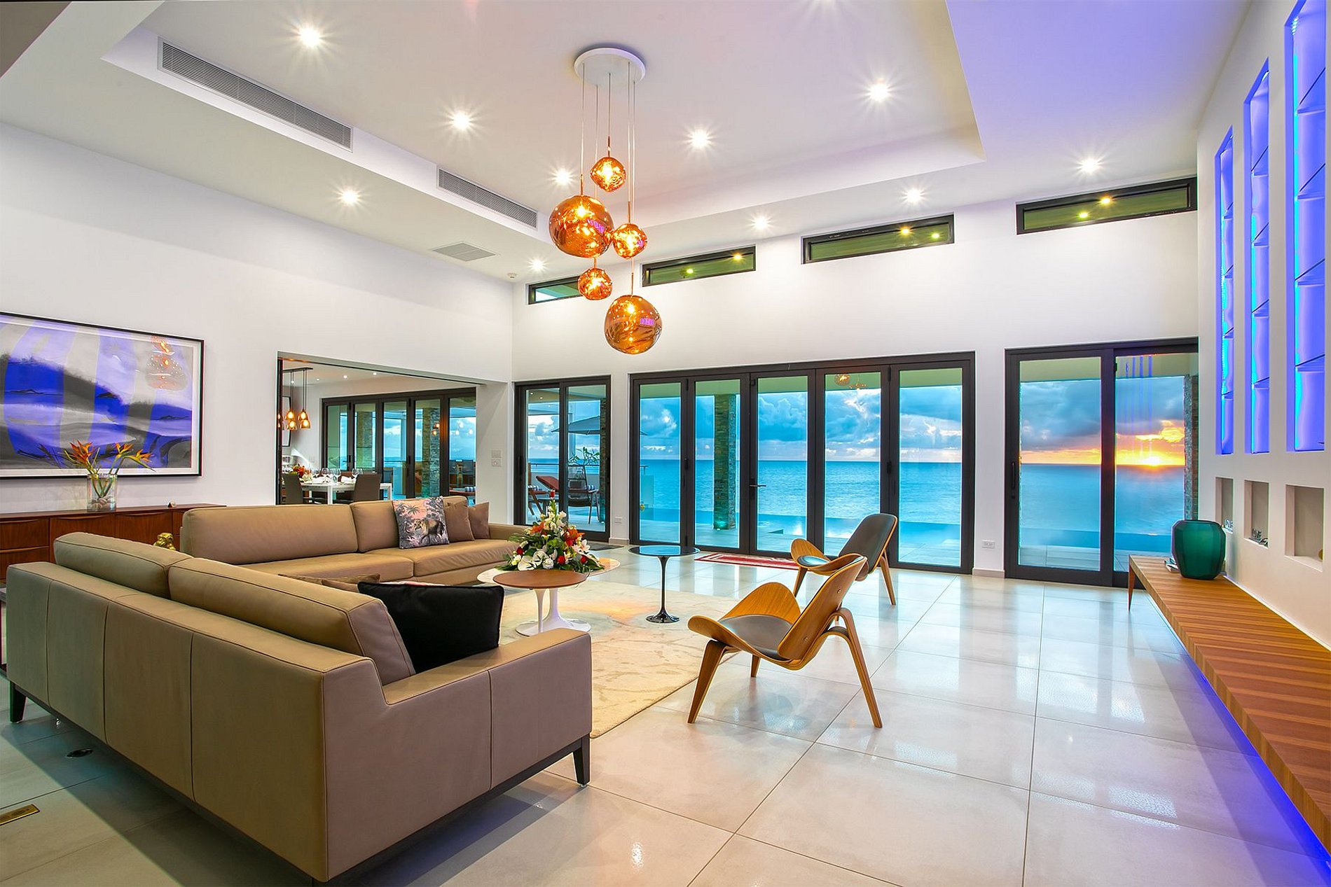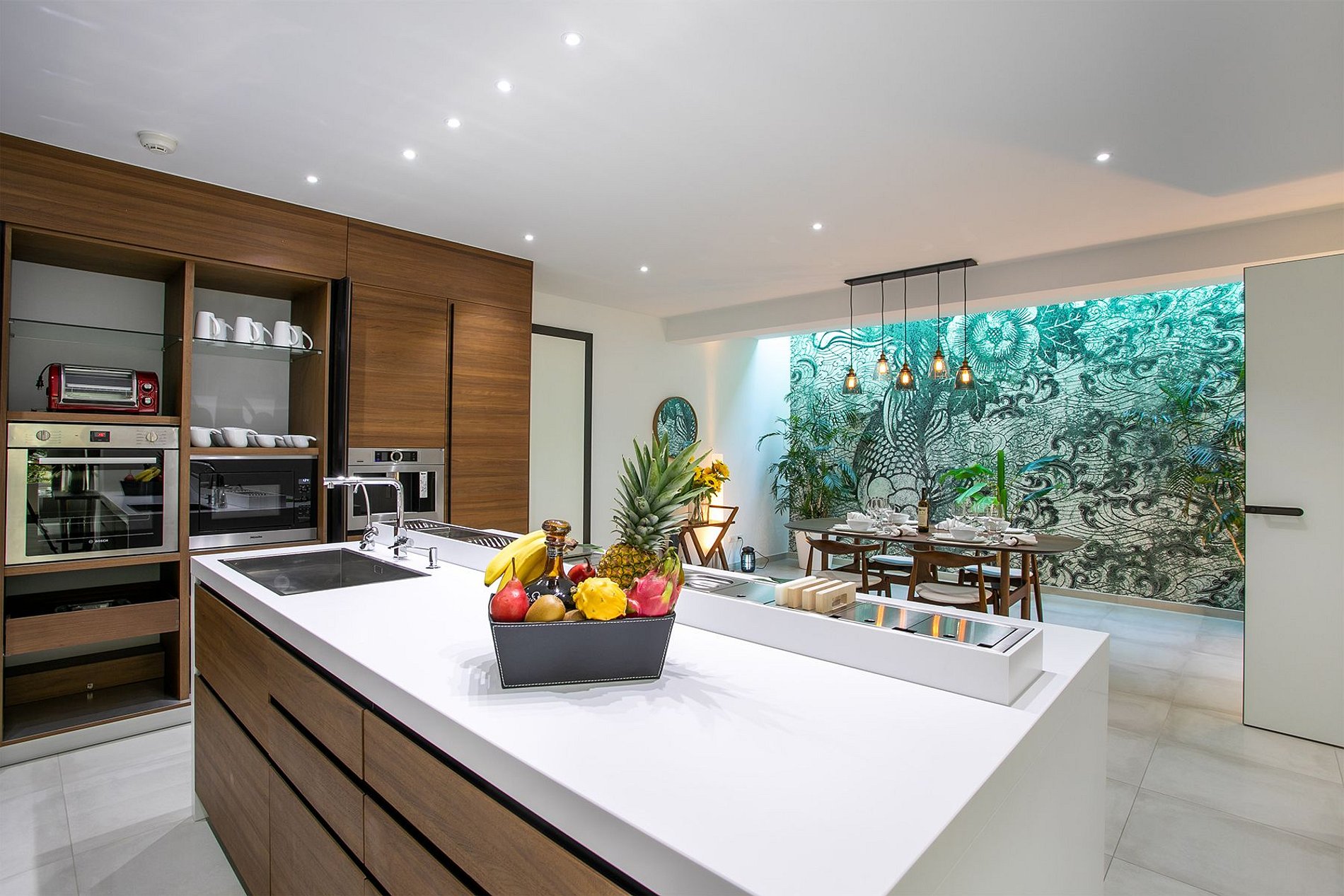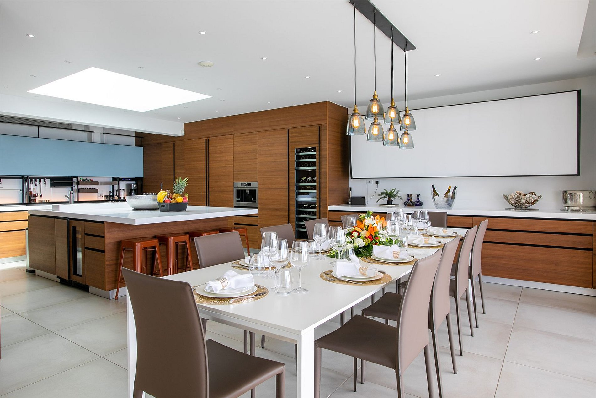 O andar principal conta com uma ampla sala de estar, sala de jantar e uma cozinha gourmet moderna. Portas de vidro do chão ao teto se abrem para o terraço da piscina, integrando perfeitamente os espaços internos e externos. A vila também inclui uma sala de mídia, academia e uma cozinha de verão no terraço – ideal para drinks ao pôr do sol.