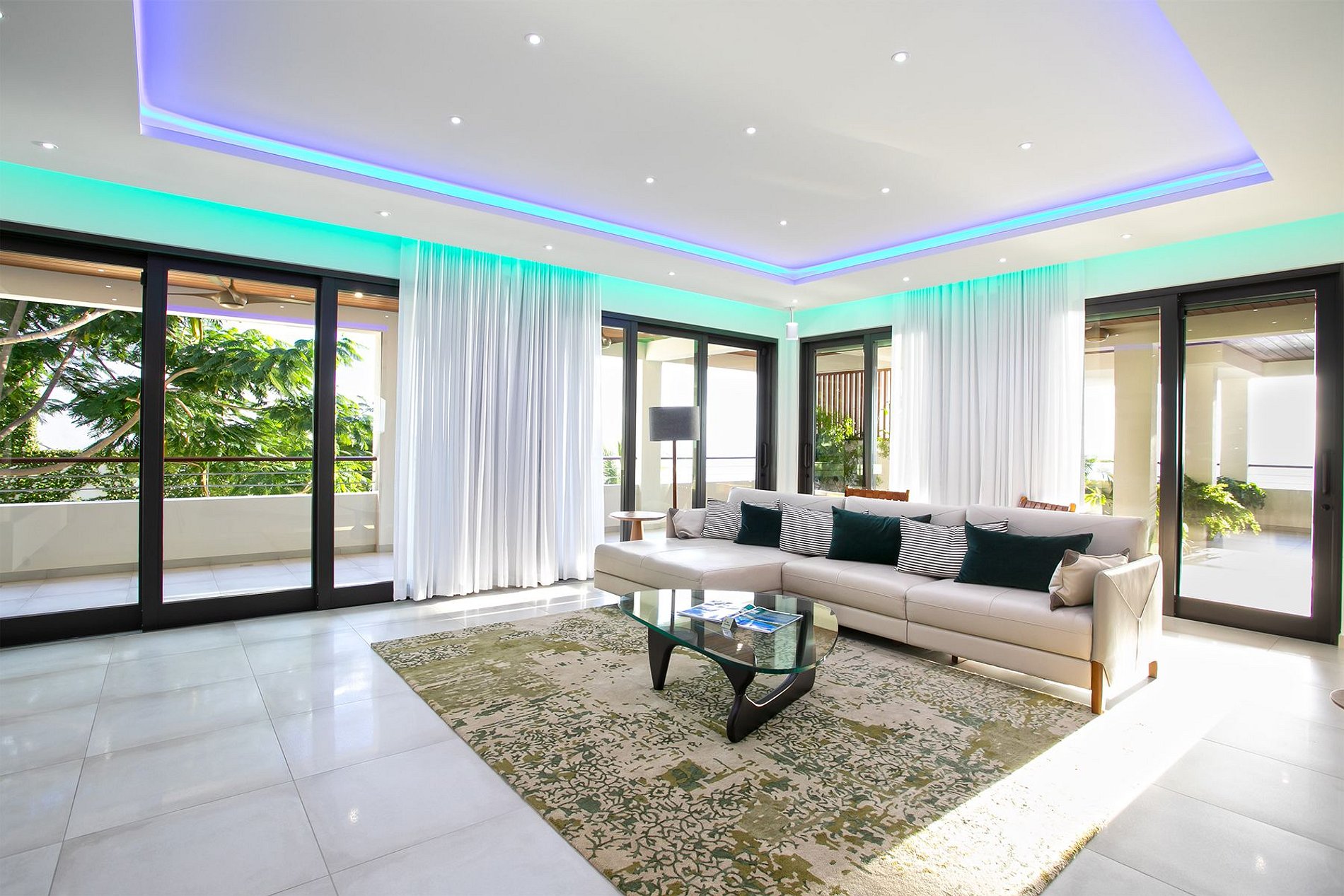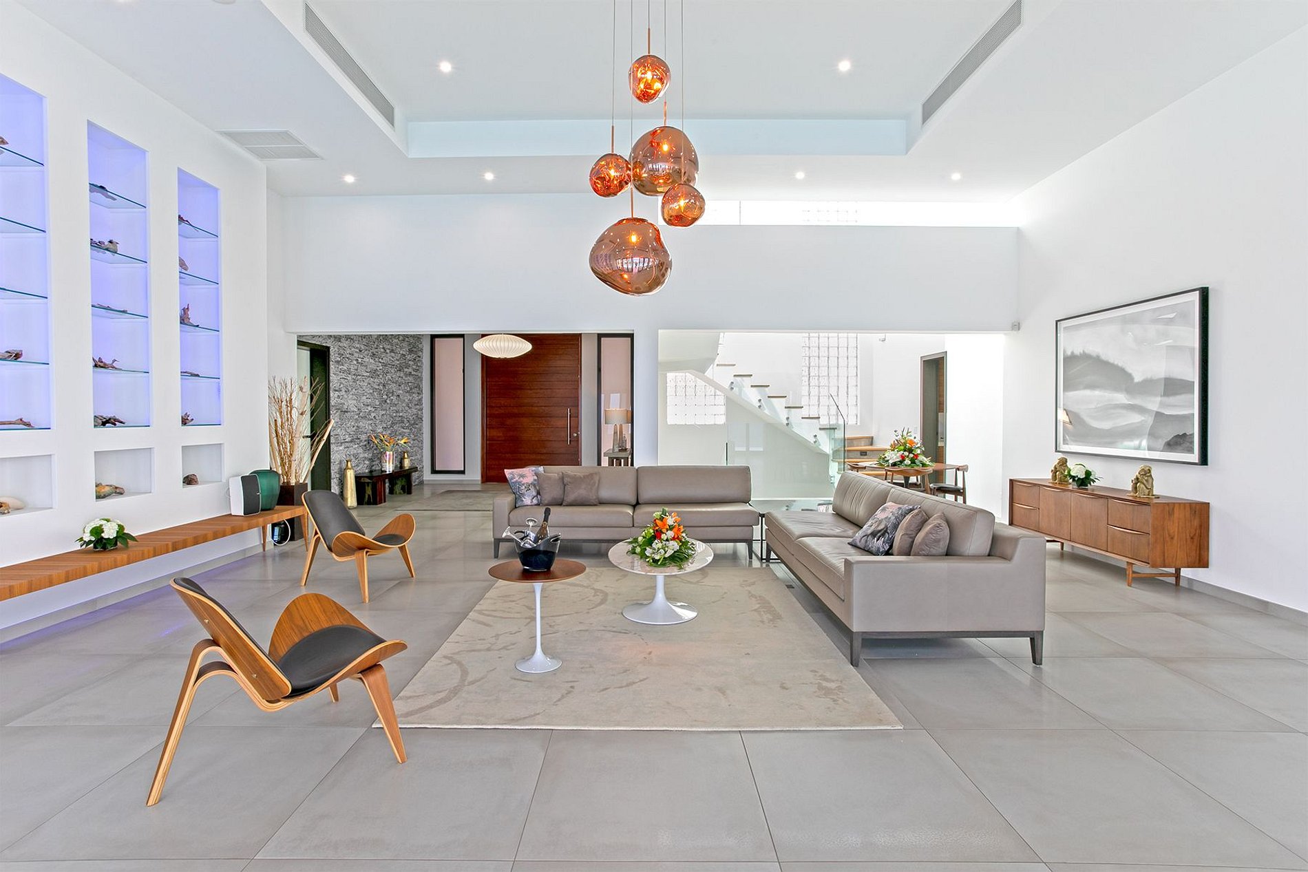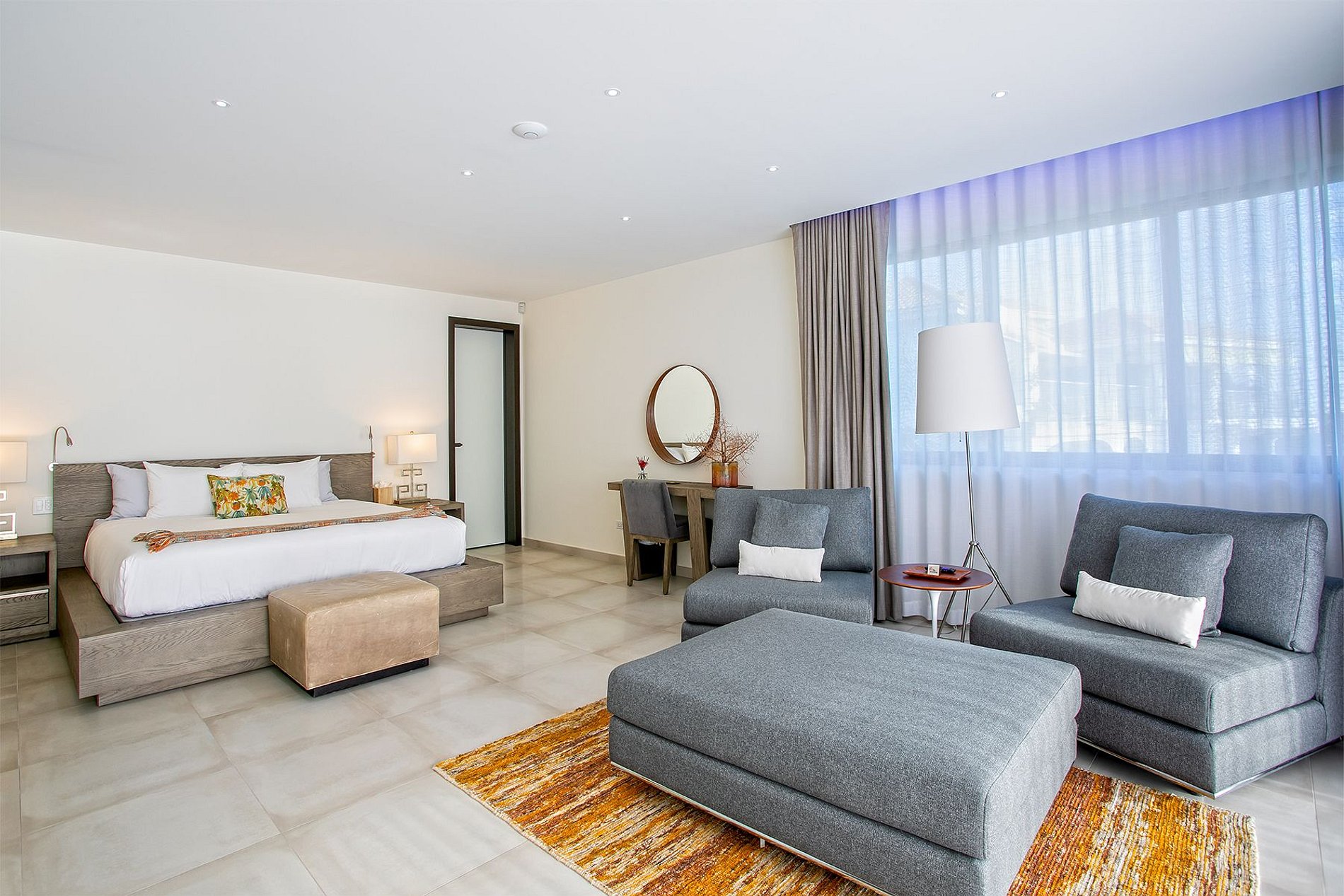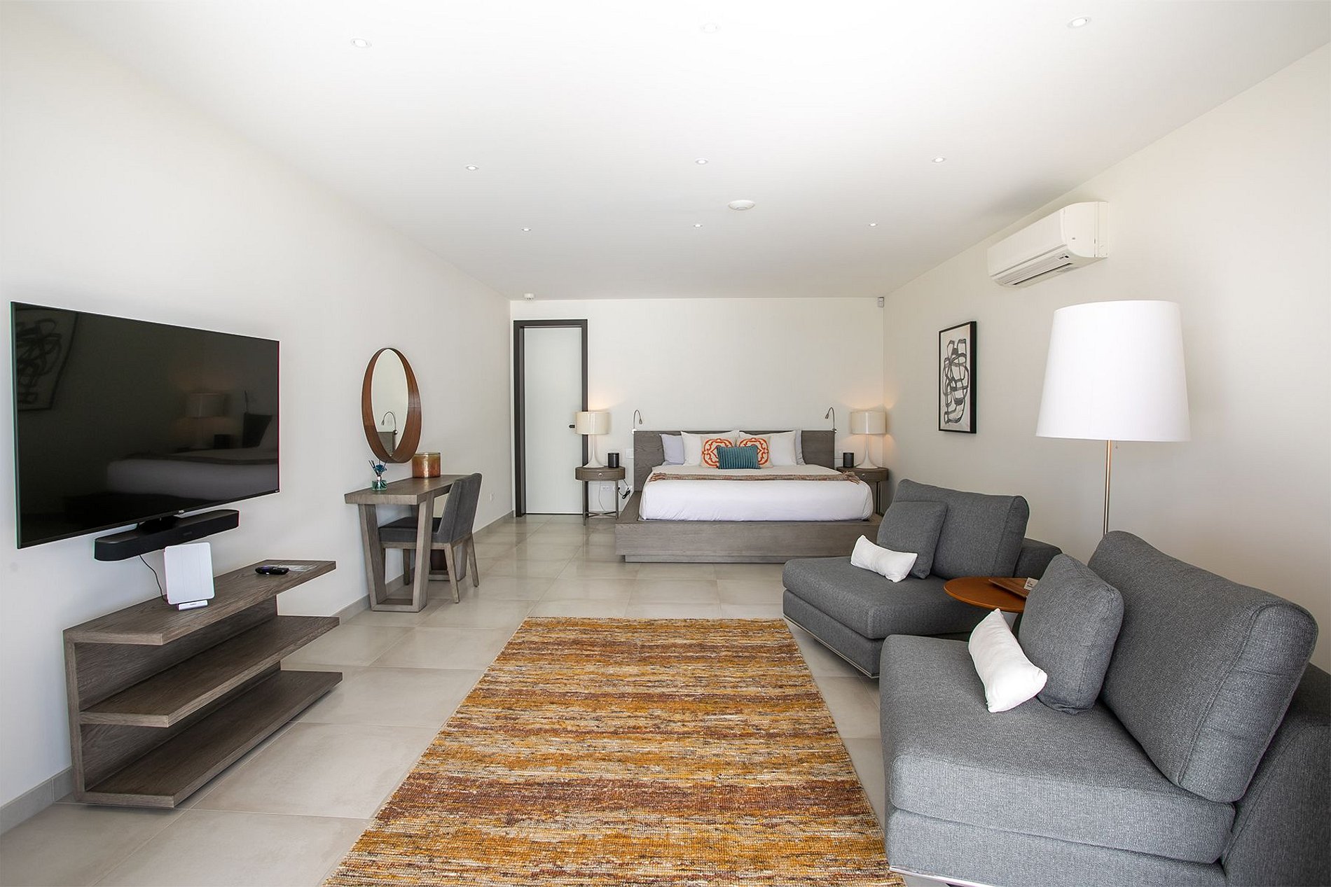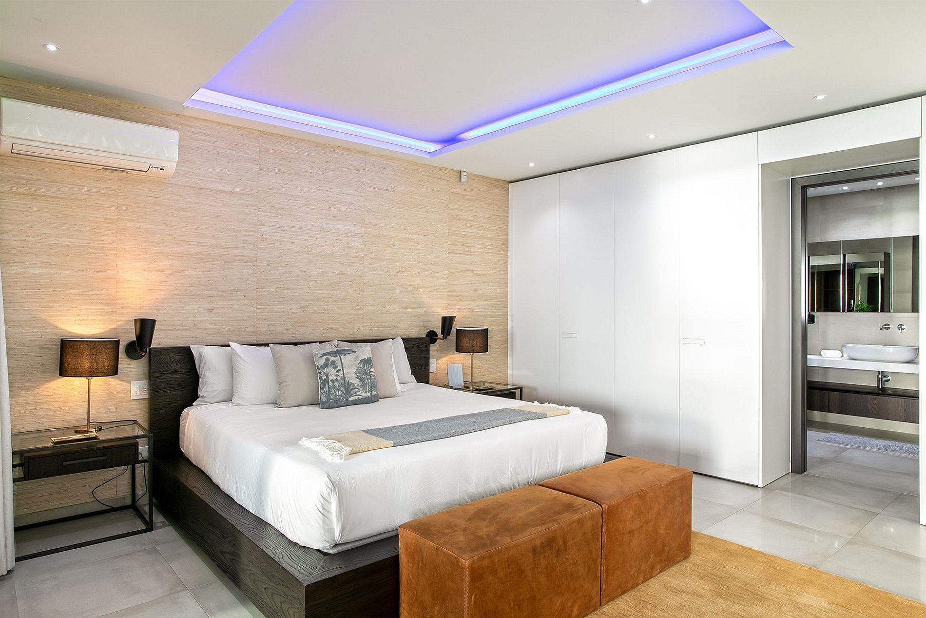 O andar principal conta com uma ampla sala de estar, sala de jantar e uma cozinha gourmet moderna. Portas de vidro do chão ao teto se abrem para o terraço da piscina, integrando perfeitamente os espaços internos e externos. A vila também inclui uma sala de mídia, academia e uma cozinha de verão no terraço – ideal para drinks ao pôr do sol.