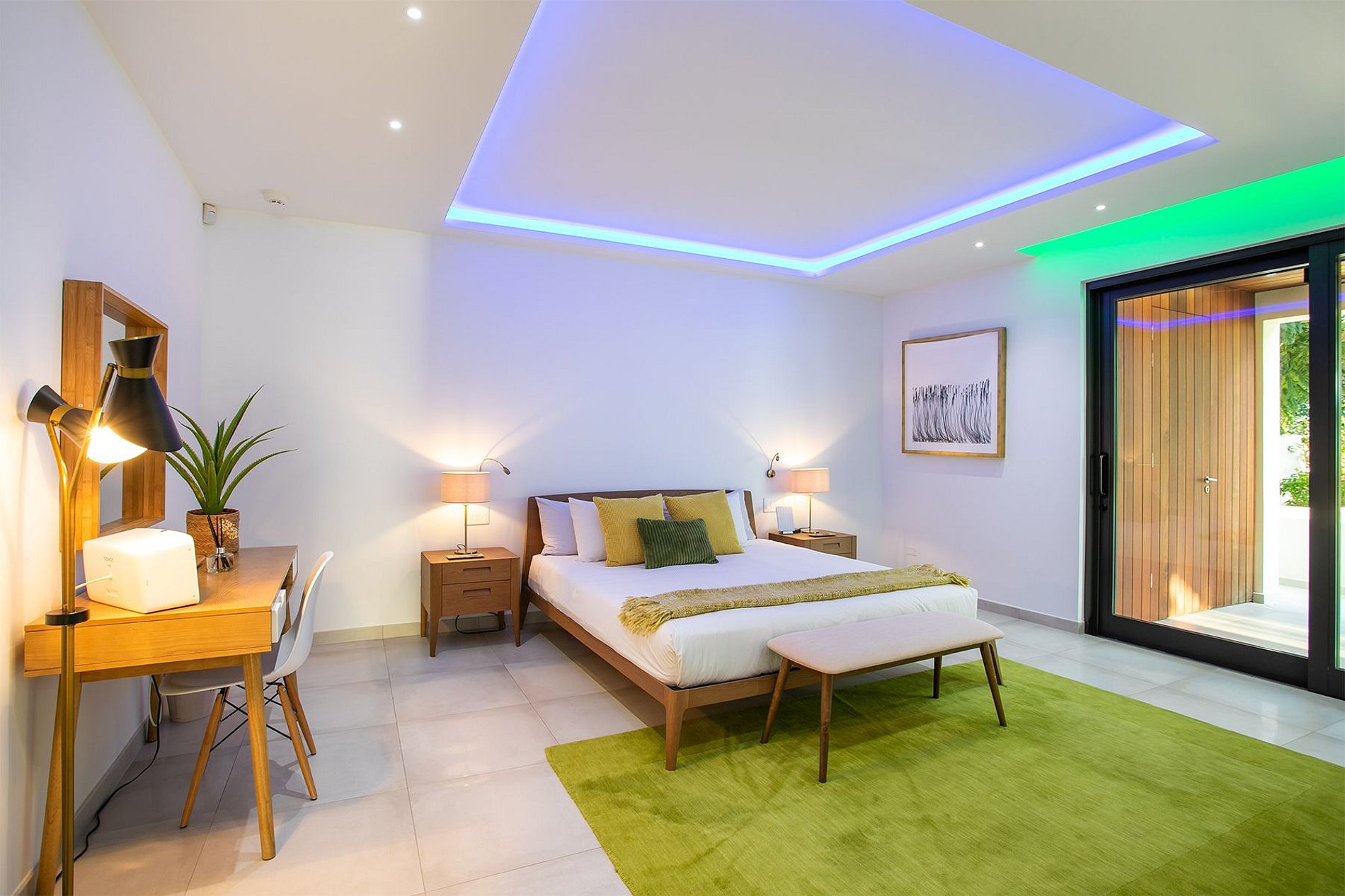 As sete suítes possuem banheiros privativos. Seis quartos têm camas king-size e um tem duas camas de casal. A casa é movida totalmente por energia solar durante o dia e utiliza tecnologia Tesla Powerwall à noite, com um sistema de automação inteligente que garante conforto e eficiência.