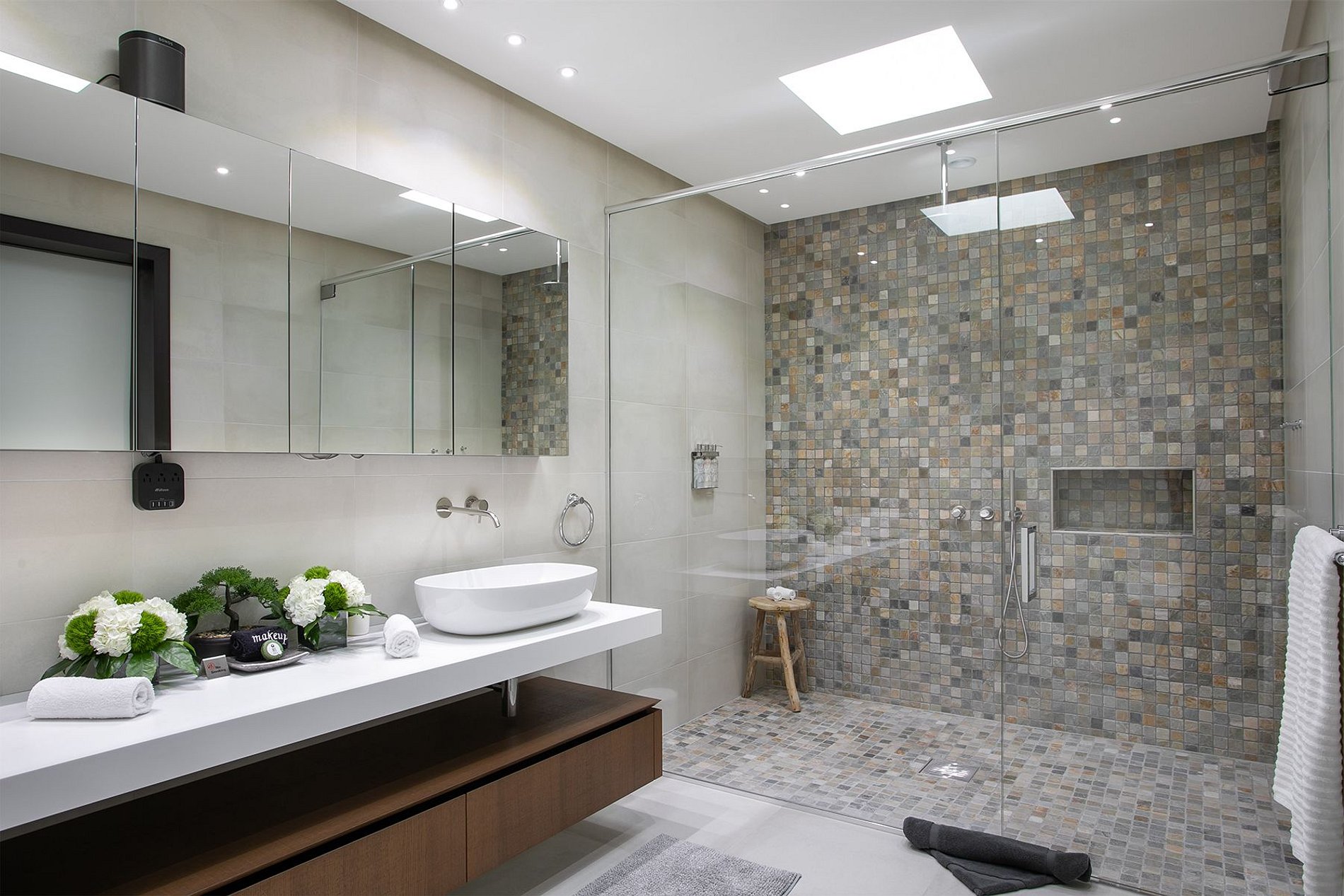 As sete suítes possuem banheiros privativos. Seis quartos têm camas king-size e um tem duas camas de casal. A casa é movida totalmente por energia solar durante o dia e utiliza tecnologia Tesla Powerwall à noite, com um sistema de automação inteligente que garante conforto e eficiência.