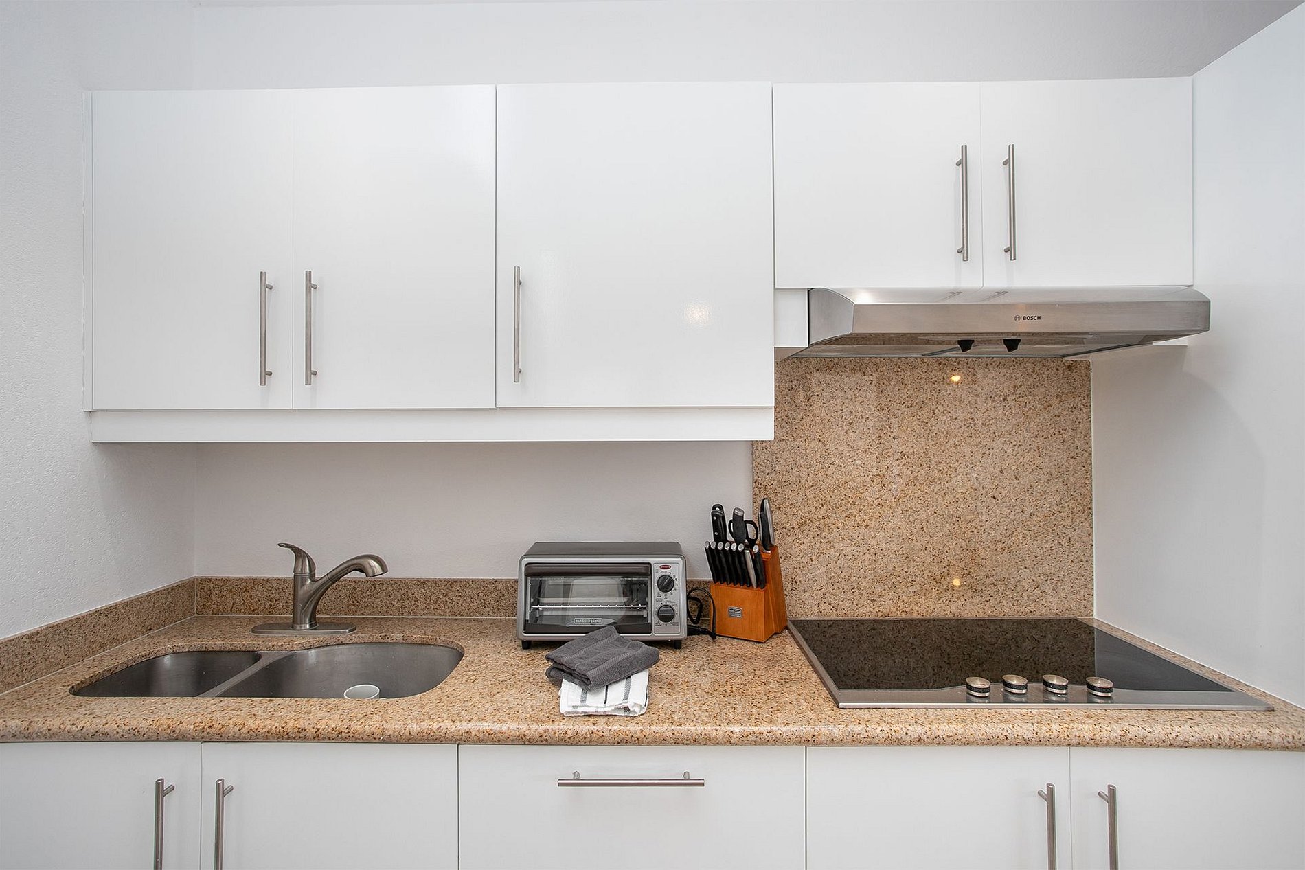 O interior conta com pé-direito alto, cozinha totalmente equipada com eletrodomésticos Viking e uma sala de estar integrada à sala de jantar que se abre para o terraço principal—ideal para o café da manhã ou um drink ao pôr do sol. Ambos os quartos possuem cama king-size, closet, banheiros de mármore com pias duplas e Smart TV. Separados entre si, são ideais para dois casais ou uma pequena família.