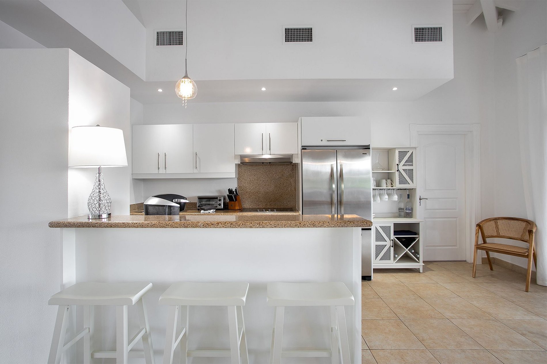 O interior conta com pé-direito alto, cozinha totalmente equipada com eletrodomésticos Viking e uma sala de estar integrada à sala de jantar que se abre para o terraço principal—ideal para o café da manhã ou um drink ao pôr do sol. Ambos os quartos possuem cama king-size, closet, banheiros de mármore com pias duplas e Smart TV. Separados entre si, são ideais para dois casais ou uma pequena família.