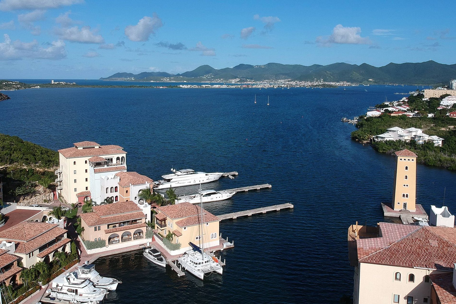 Este apartamento elegante está localizado no último andar de um edifício de dois andares, com vista para a marina, a lagoa e o mar do Caribe. Com dois quartos espaçosos e três terraços à beira-mar, oferece privacidade, conforto e vistas panorâmicas de todos os ângulos.