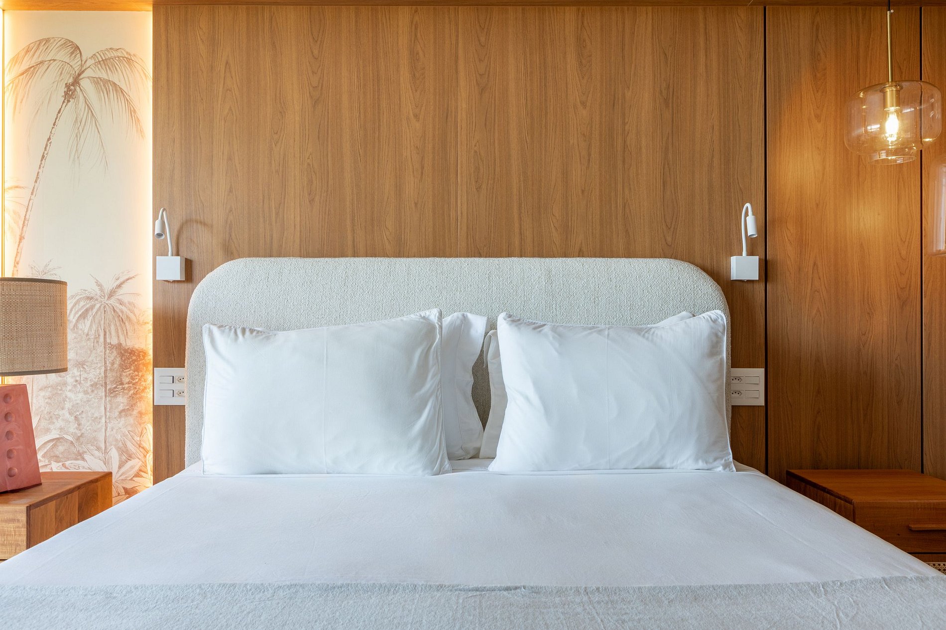 A cobertura possui duas suítes espaçosas, com decoração elegante e vistas deslumbrantes. Uma delas apresenta uma charmosa parede revestida com azulejos artísticos, enquanto a outra se destaca pela combinação harmoniosa de madeira e tons claros, criando um ambiente convidativo e relaxante.