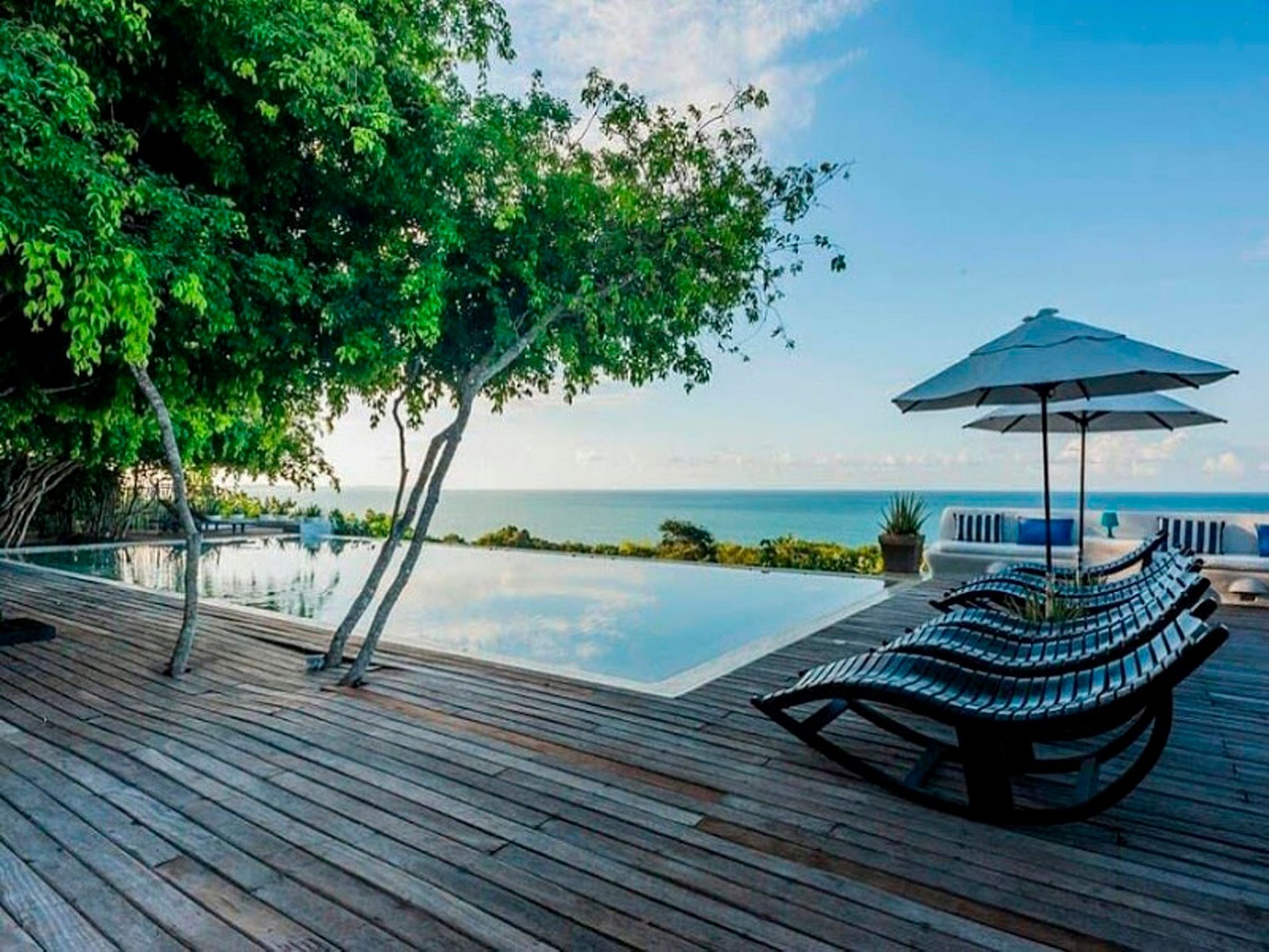 A grande piscina é um dos pontos altos da casa. A piscina abrange uma grande área no terraço enorme da propriedade, e oferece uma vista absolutamente inesquecível sobre o mar. No entorno você vai encontrar espreguiçadeiras e guarda-sóis.
