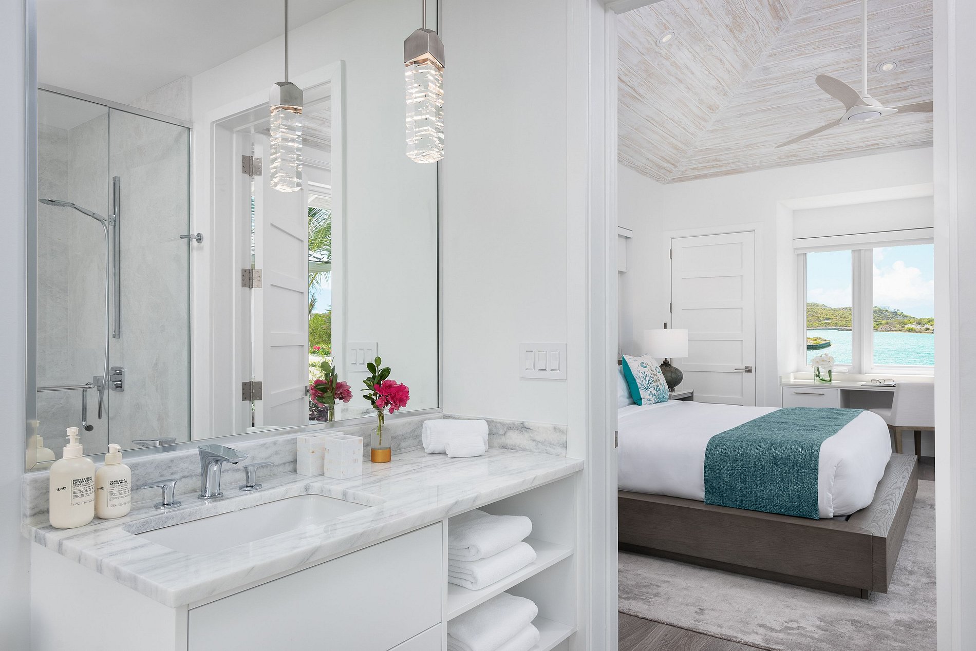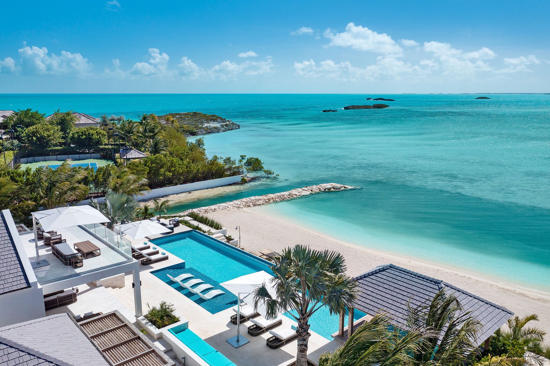 Os interiores são elegantes e minimalistas, com madeira natural e pedra se integrando perfeitamente ao ambiente. As comodidades incluem uma área de jantar interna/externa coberta, sala de estar espaçosa, academia privativa e piscina externa aquecida. Cada um dos oito quartos possui banheiro privativo com chuveiros internos e externos, com uma combinação de camas king-size e camas de solteiro na casa principal e nos pavilhões. A vila também oferece praia privativa, equipe completa com mordomo e chef, traslados de ida e volta para o aeroporto e esportes aquáticos não motorizados para uma experiência completa na ilha.