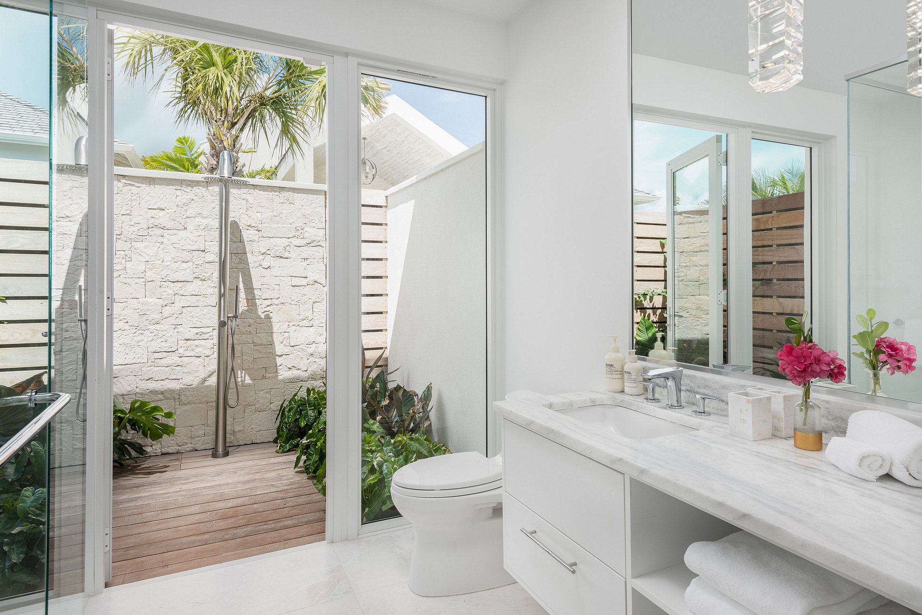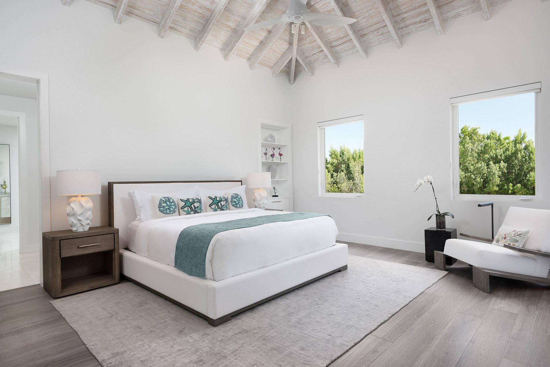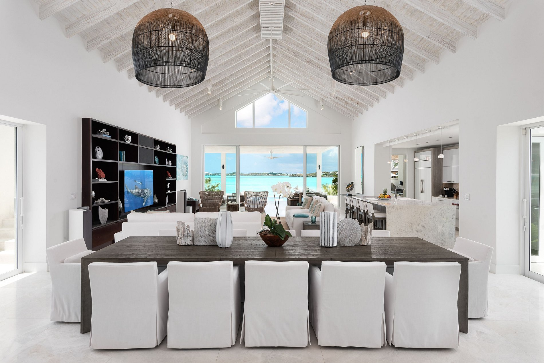 Os interiores são elegantes e minimalistas, com madeira natural e pedra se integrando perfeitamente ao ambiente. As comodidades incluem uma área de jantar interna/externa coberta, sala de estar espaçosa, academia privativa e piscina externa aquecida. Cada um dos oito quartos possui banheiro privativo com chuveiros internos e externos, com uma combinação de camas king-size e camas de solteiro na casa principal e nos pavilhões. A vila também oferece praia privativa, equipe completa com mordomo e chef, traslados de ida e volta para o aeroporto e esportes aquáticos não motorizados para uma experiência completa na ilha.