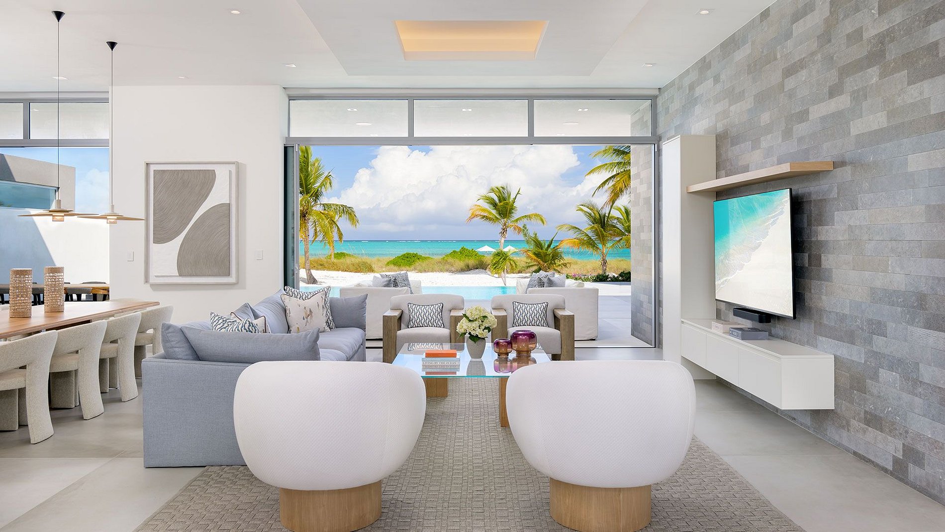 Projetada com os mais altos padrões, conta com uma planta aberta, pé-direito alto, luz natural e acabamentos elegantes em pedra, granito e quartzo. As janelas panorâmicas destacam o mar turquesa, enquanto a varanda de vidro e o terraço com piscina proporcionam o cenário perfeito para relaxar e aproveitar o melhor de Grace Bay.