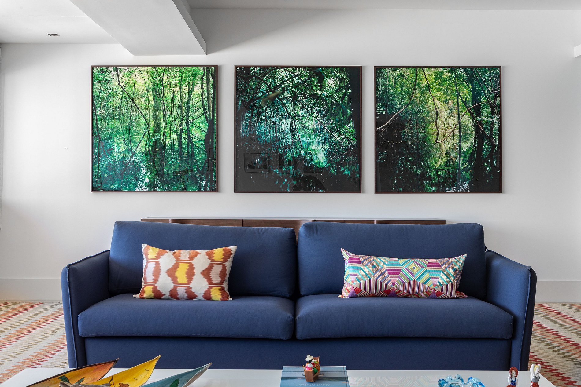 No coração do apartamento, uma ampla sala de estar banhada por luz natural se abre para janelas do chão ao teto, revelando uma vista deslumbrante da Baía de Copacabana — do forte histórico à direita até as montanhas verdes de Leme.