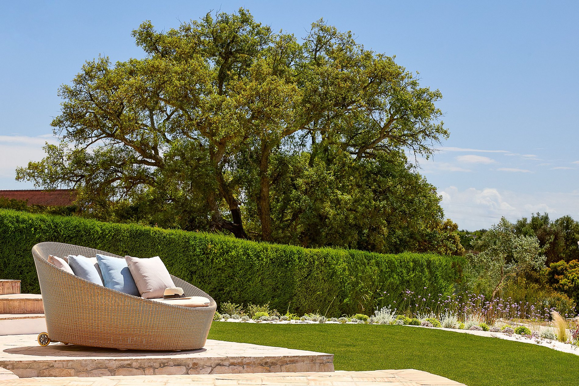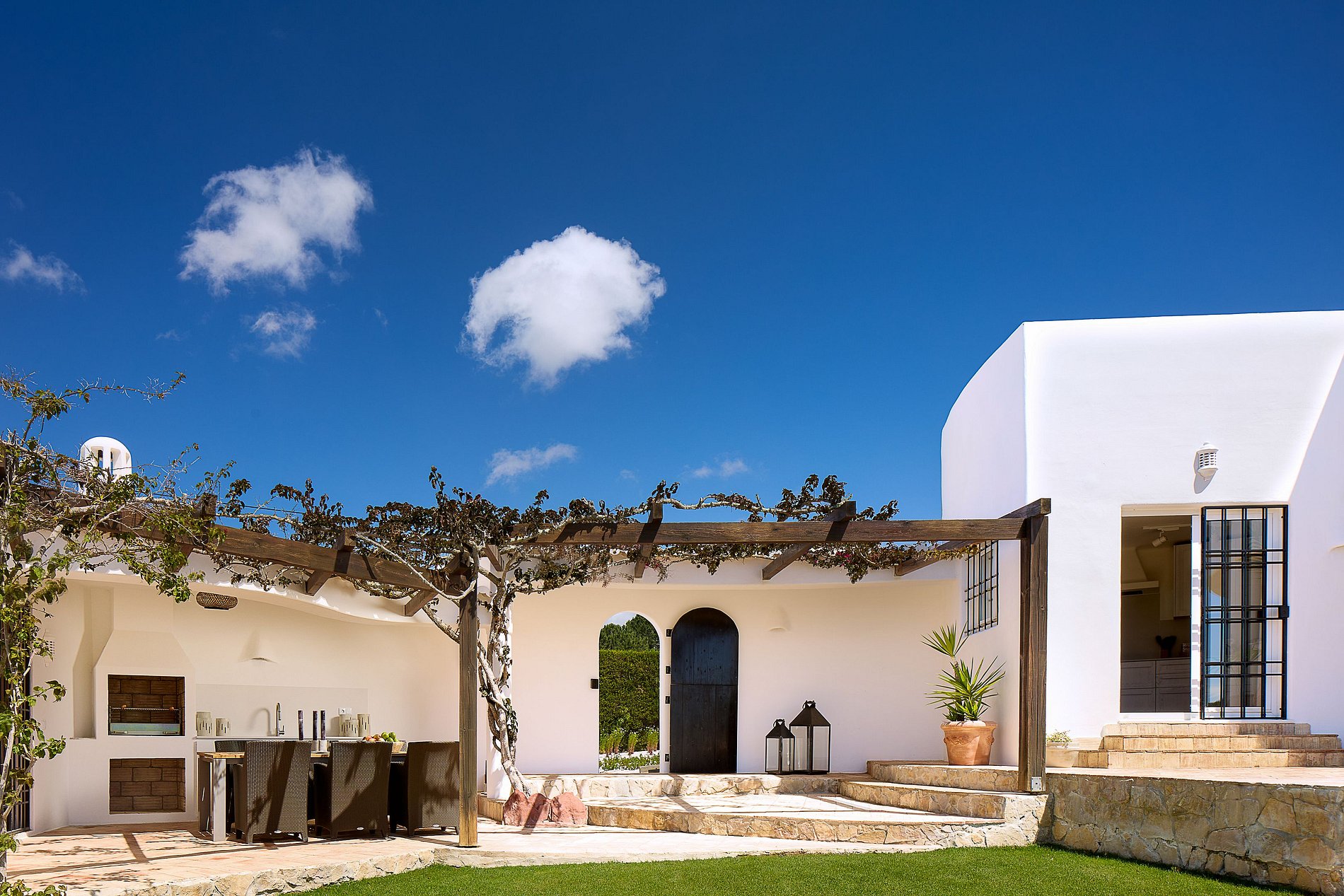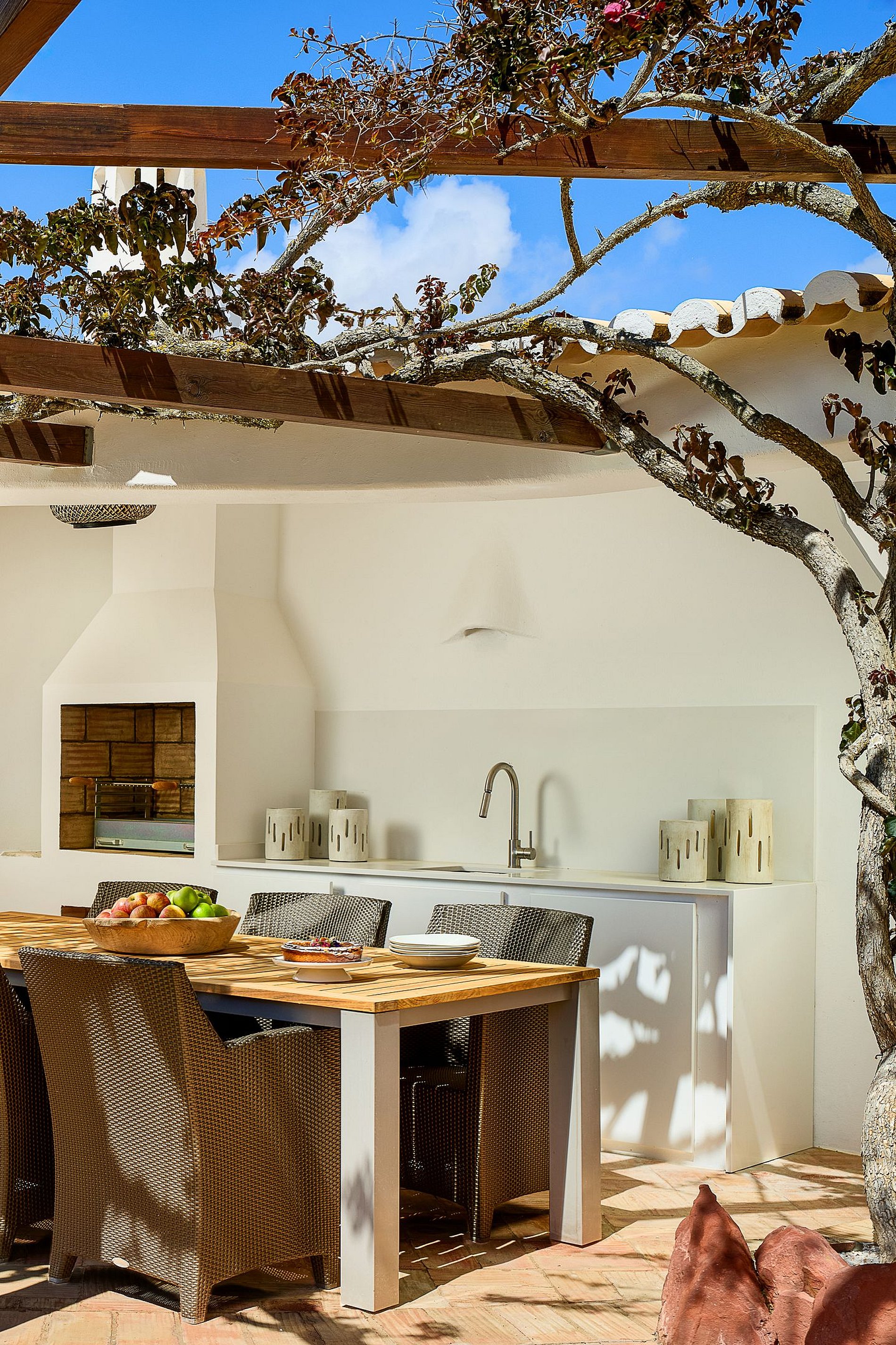 Portas de vidro abrem para um terraço privativo com área para refeições ao ar livre. A piscina aquecida, as espreguiçadeiras ao sol e o jardim exuberante criam o cenário perfeito para relaxar sob os céus ensolarados do sul de Portugal. Um lugar para desacelerar, respirar fundo e saborear o melhor do Algarve rural.