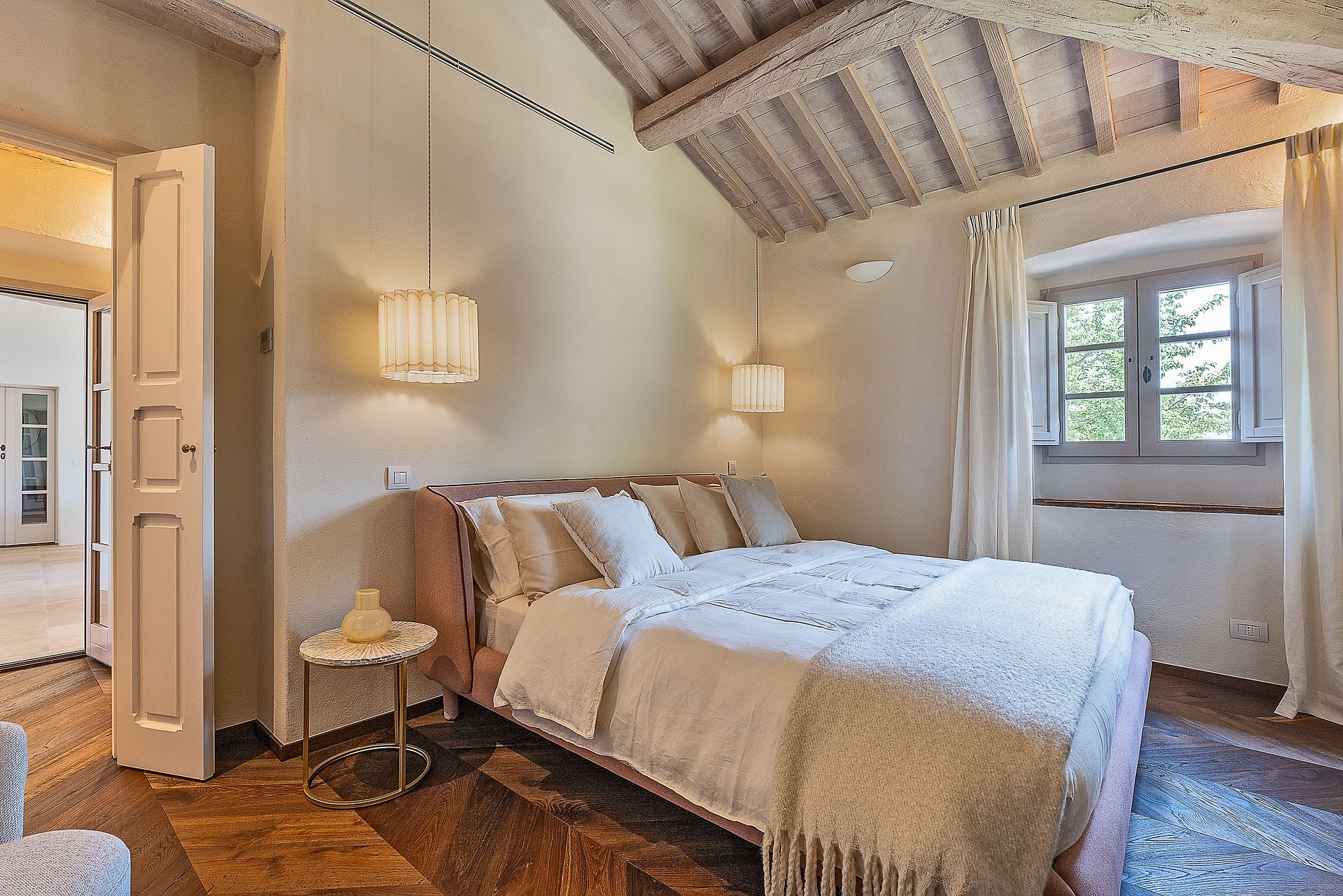 Um dos quartos fica na antiga torre da casa e oferece uma experiência única, com vista de 360° da paisagem ao redor. Outros possuem acesso direto às áreas externas, terraços ou ao jardim de oliveiras.