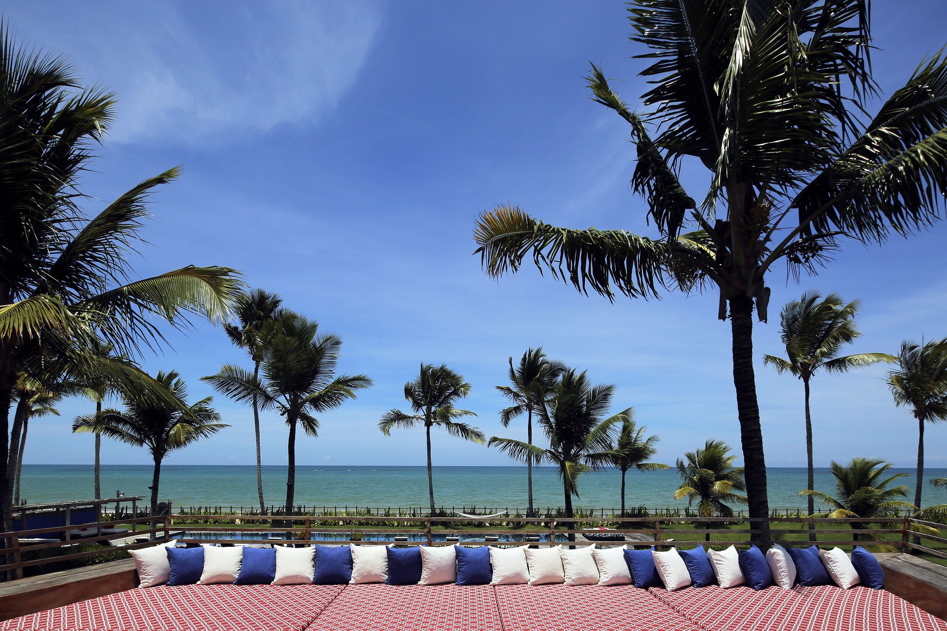 Área da piscina com sofás, espreguiçadeiras, pergolado, todos os espaços da piscina tem vista para a praia e para o mar.