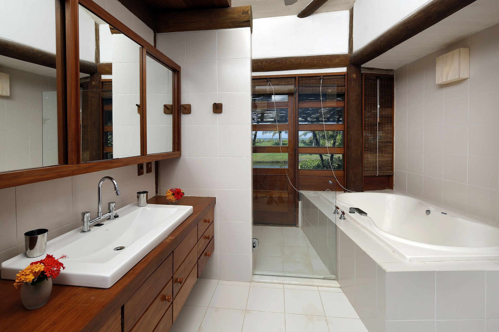 Suíte 05: Cama dossel queen ar condicionado, TV, escrivaninha, walk-in closet, ducha e banheira, vista para o manguezal e jardim tropical