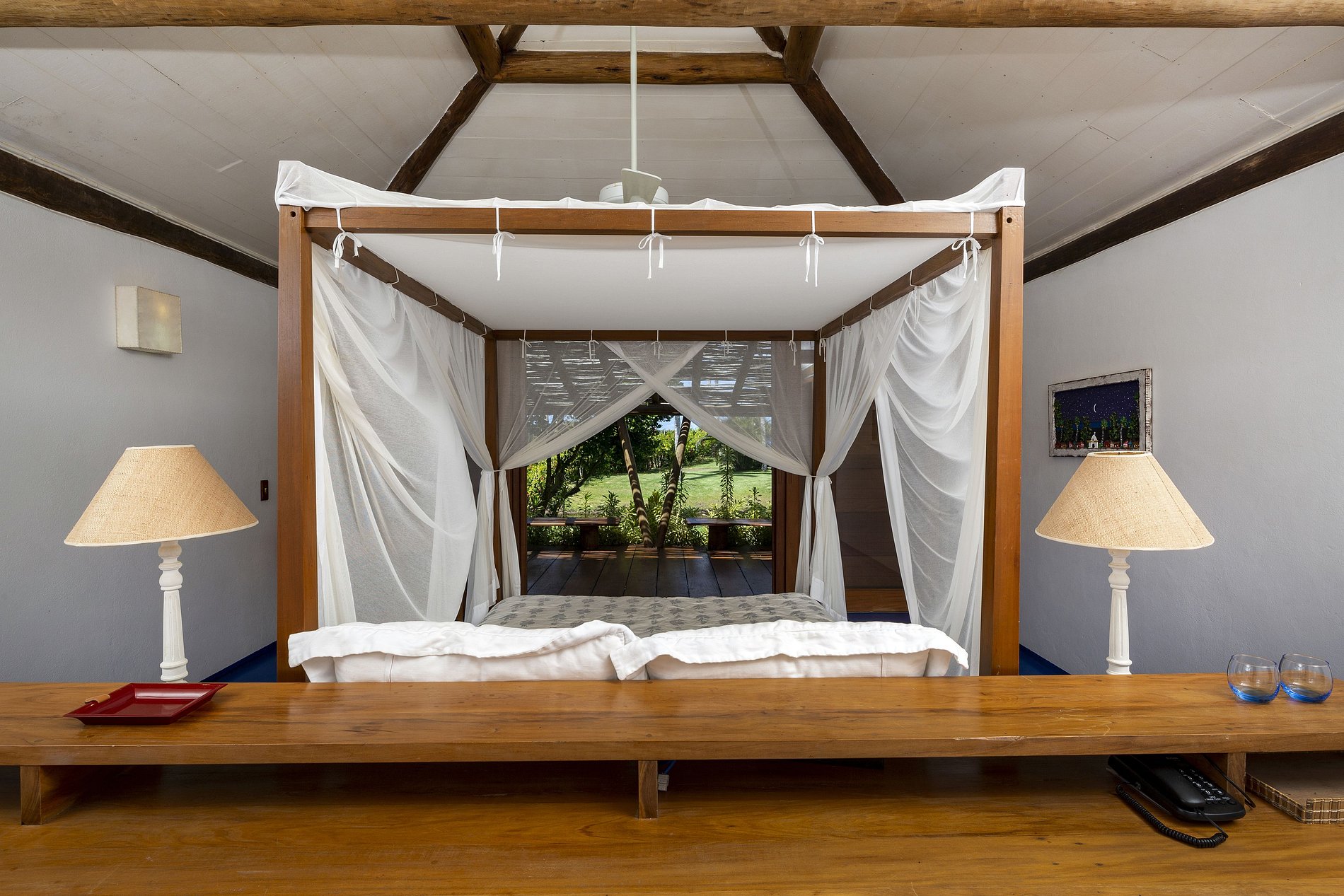 Suíte 04: Cama dossel queen ar condicionado, TV, escrivaninha, vista para o rio e mar.
