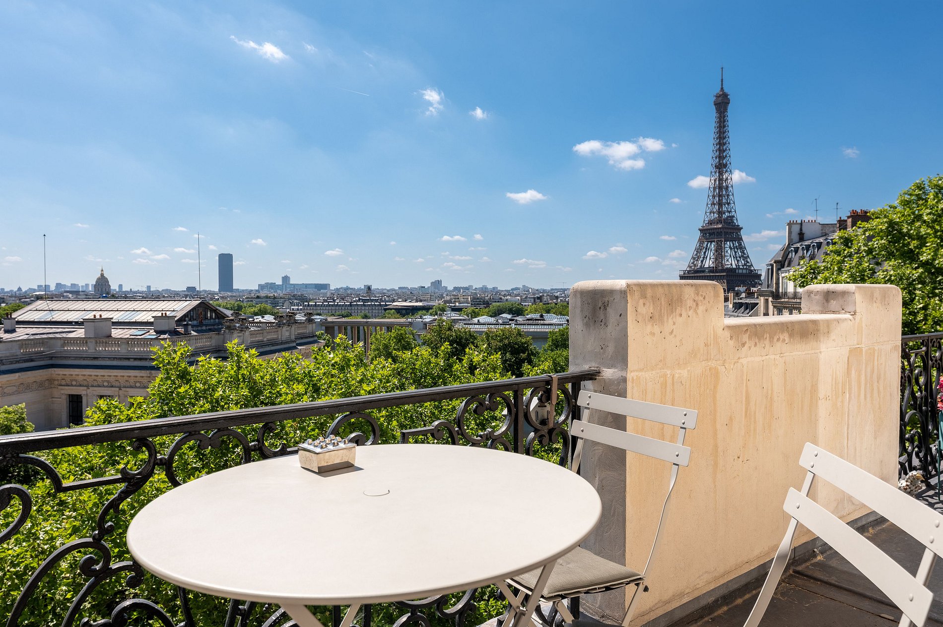 A área social — composta pela sala de estar, sala de jantar e cozinha totalmente equipada — se abre para um amplo terraço que percorre toda a fachada do apartamento. Largo o suficiente para acomodar refeições ao ar livre ou um aperitivo ao entardecer, o terraço revela uma das vistas mais impressionantes da capital francesa: a Torre Eiffel, Les Invalides, o Panthéon, o Palais de Tokyo e, bem em frente, o Palais Galliera.