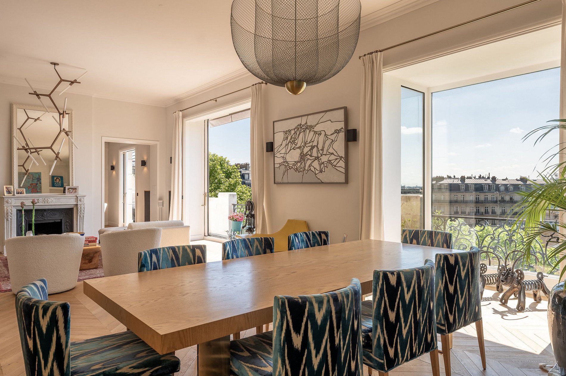 A área social — composta pela sala de estar, sala de jantar e cozinha totalmente equipada — se abre para um amplo terraço que percorre toda a fachada do apartamento. Largo o suficiente para acomodar refeições ao ar livre ou um aperitivo ao entardecer, o terraço revela uma das vistas mais impressionantes da capital francesa: a Torre Eiffel, Les Invalides, o Panthéon, o Palais de Tokyo e, bem em frente, o Palais Galliera.