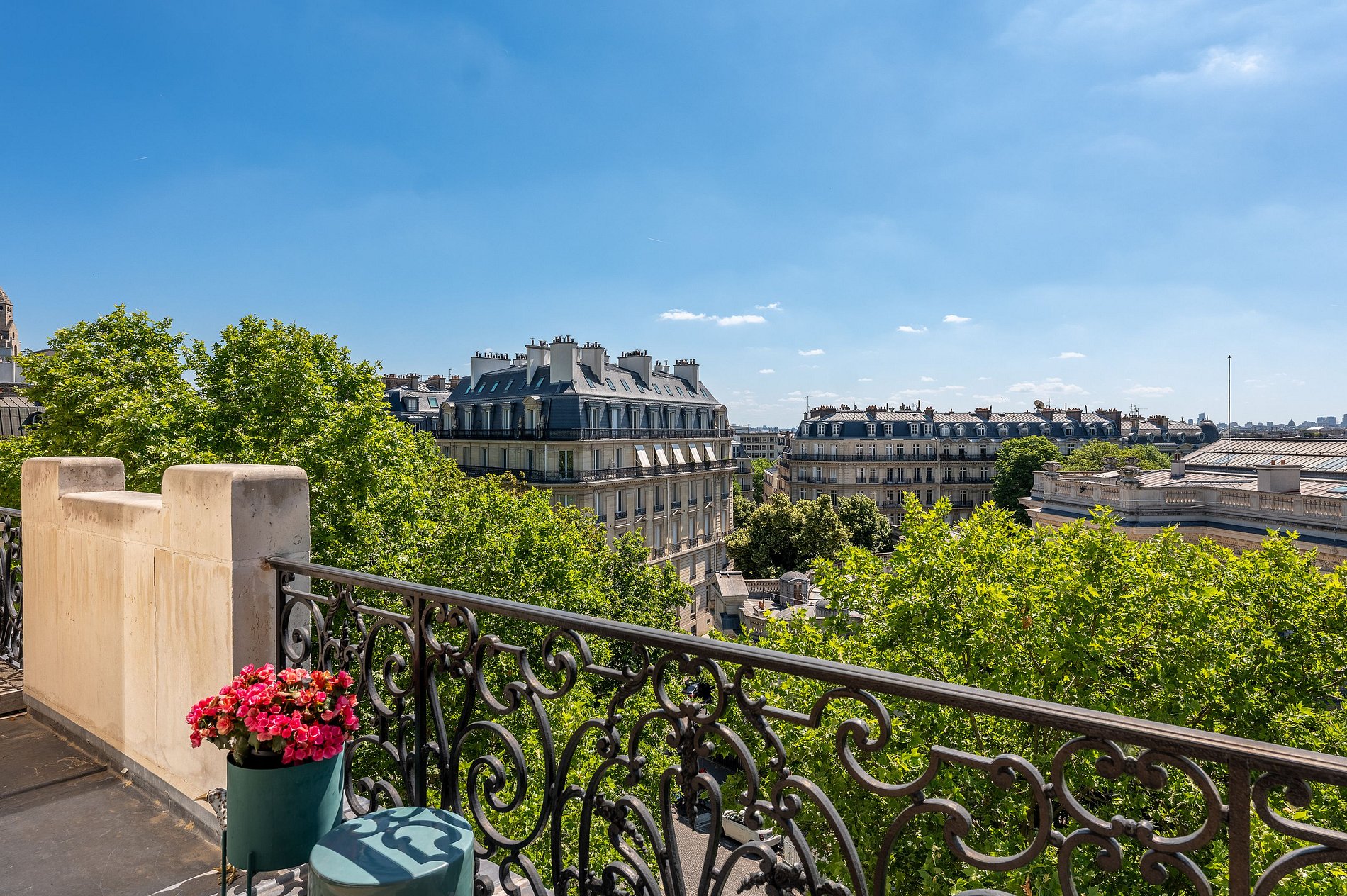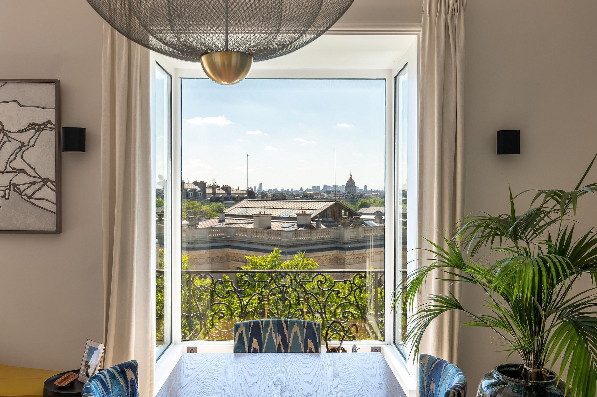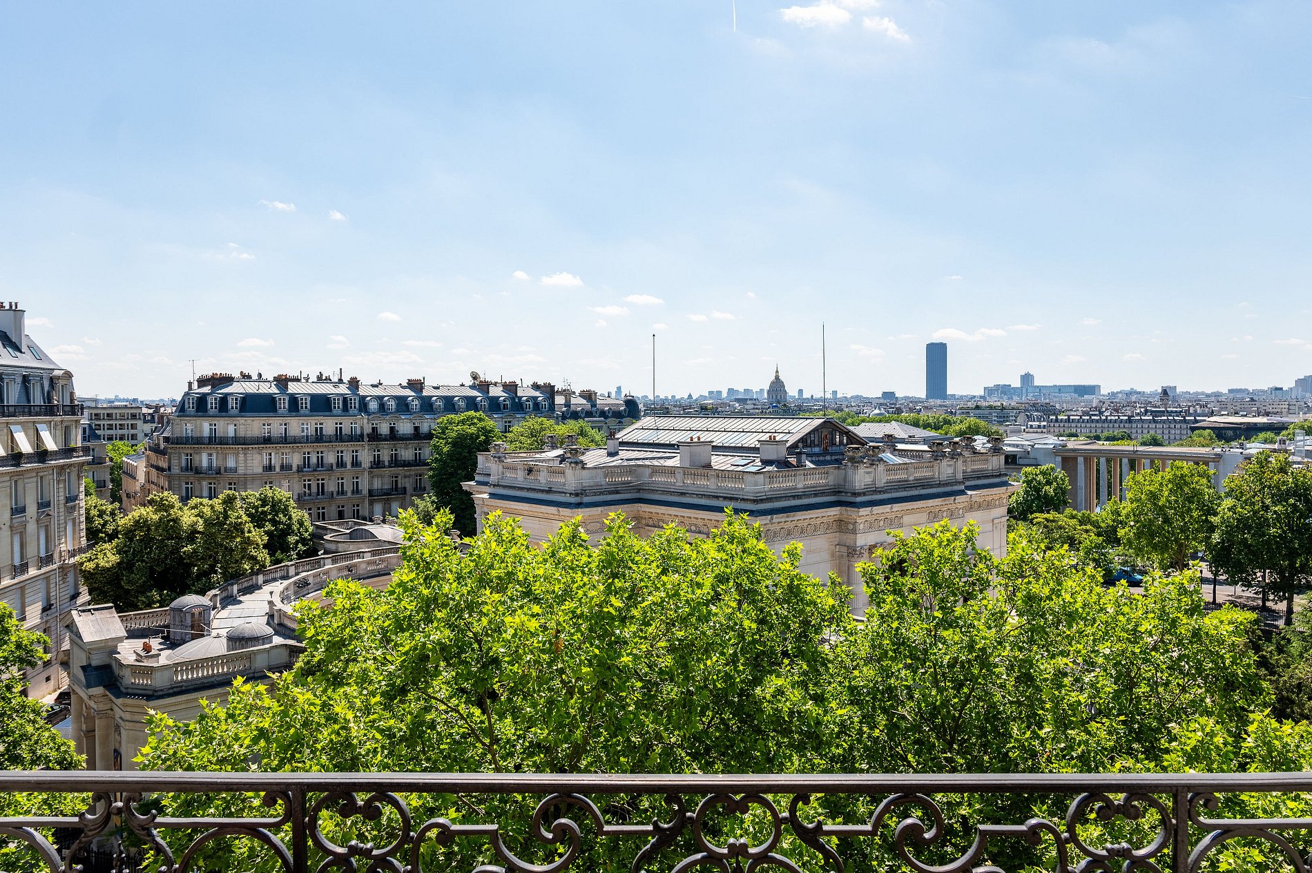 A área social — composta pela sala de estar, sala de jantar e cozinha totalmente equipada — se abre para um amplo terraço que percorre toda a fachada do apartamento. Largo o suficiente para acomodar refeições ao ar livre ou um aperitivo ao entardecer, o terraço revela uma das vistas mais impressionantes da capital francesa: a Torre Eiffel, Les Invalides, o Panthéon, o Palais de Tokyo e, bem em frente, o Palais Galliera.