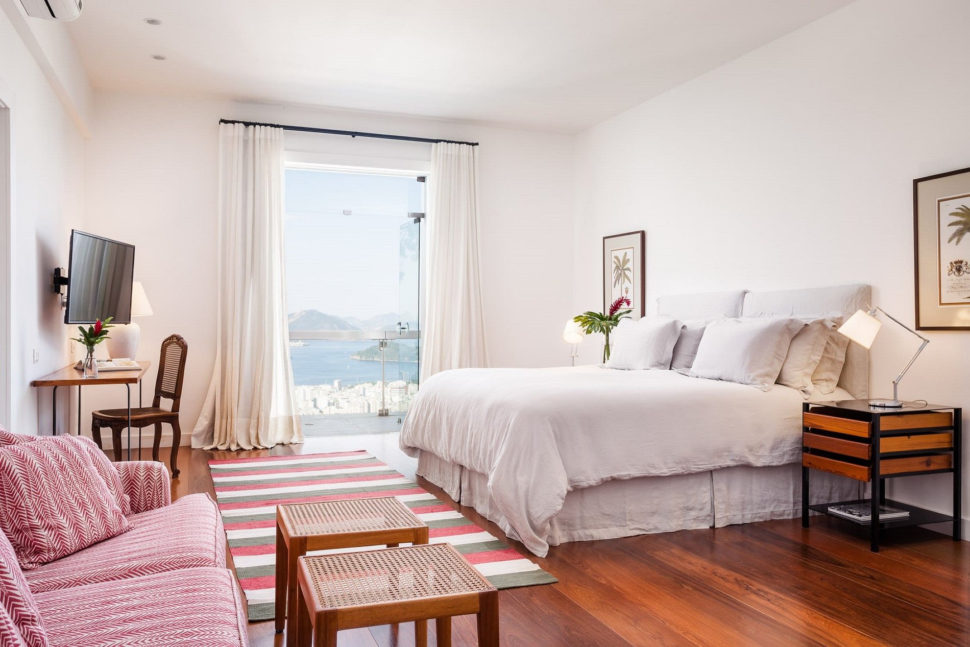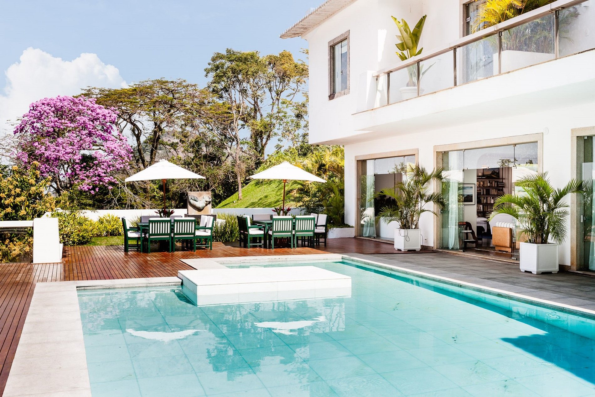 Agora disponível pela primeira vez para aluguel privativo, esta villa de 7 quartos está localizada nos terrenos da propriedade particular de uma das famílias mais antigas e notáveis do Rio, escondida no coração de Santa Teresa. Um refúgio completo no meio da cidade, silencioso, salvo pelo som dos pássaros e da brisa nas amendoeiras, a mansão branca modernista dos anos 1970 está envolvida na floresta tropical da Mata Atlântica, enquanto vistas abaixo do Rio Pão de Açúcar, paisagem urbana e brilhante baía de Guanabara.