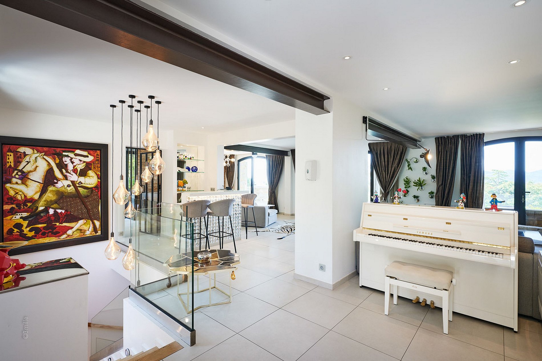 No andar térreo, a villa oferece um espaço de bem-estar com sala de massagem, banheiros adicionais, uma cozinha de verão equipada, e uma pergola bioclimática, além de uma área gourmet com churrasqueira e plancha — perfeita para refeições ao ar livre em um ambiente tranquilo e rodeado de verde.