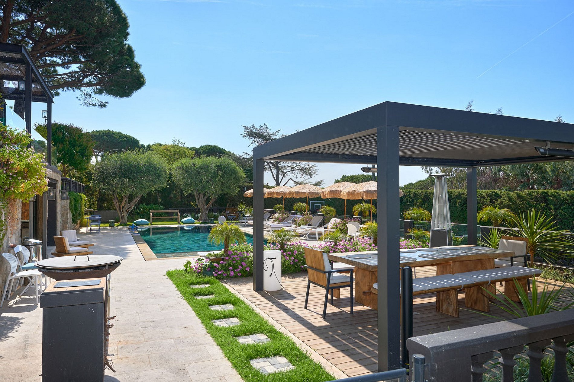 No andar térreo, a villa oferece um espaço de bem-estar com sala de massagem, banheiros adicionais, uma cozinha de verão equipada, e uma pergola bioclimática, além de uma área gourmet com churrasqueira e plancha — perfeita para refeições ao ar livre em um ambiente tranquilo e rodeado de verde.