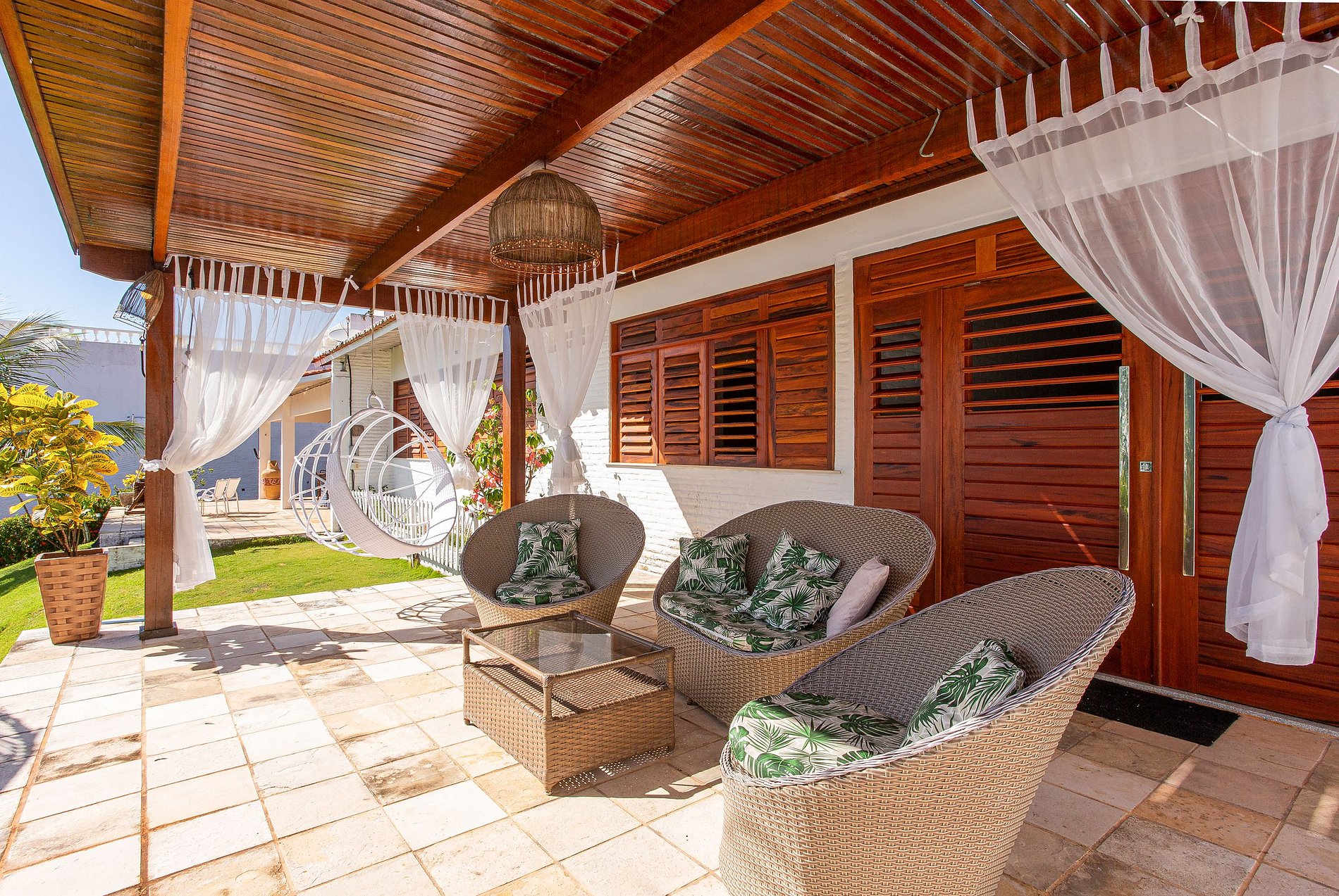 A casa está dividida entre a casa principal e a casa anexa. A casa principal é cercada por um terraço com vários lounges ao ar livre, redes e uma mesa para refeições para 8 pessoas. No interior encontra-se a sala de estar com tv a cabo e uma zona de refeições junto à cozinha. A cozinha aberta está totalmente equipada.
