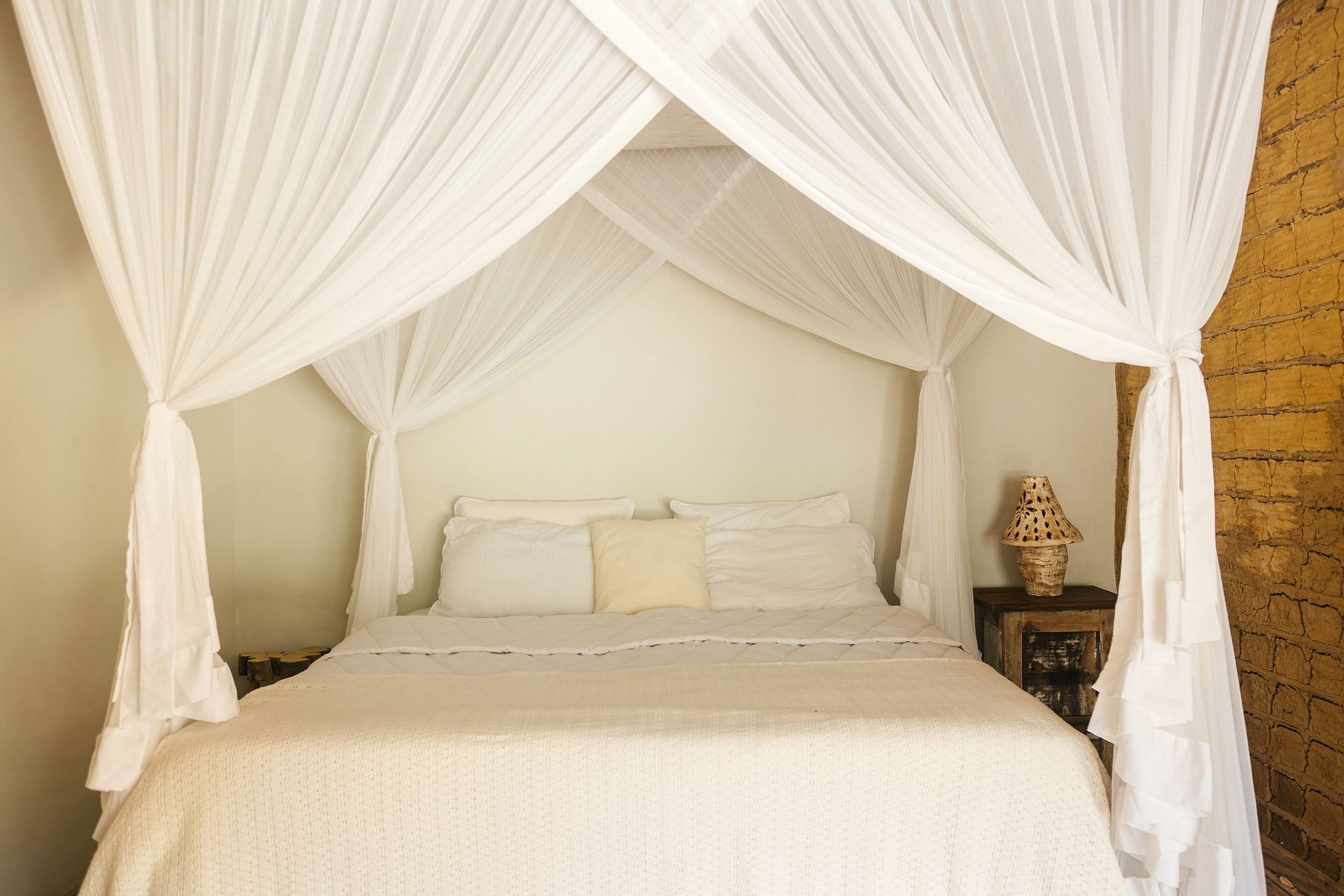 A casa principal tem 3 suítes tendo banheiros lindos. Todas equipadas e completas. Ao lado da piscina a casa tem 2 bangalo, bem charmosos. Todos os quartos tem mosquiteiro.