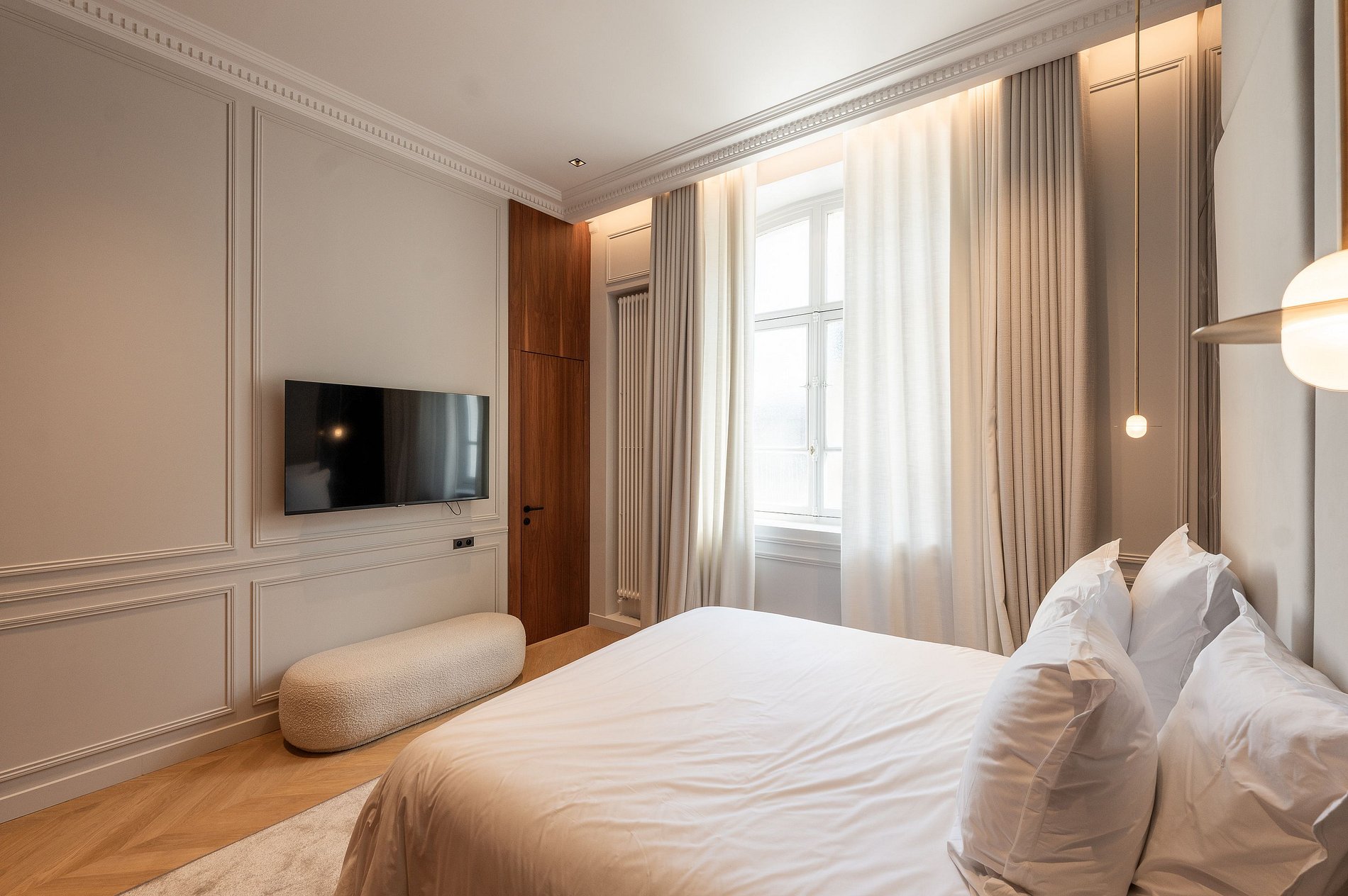 Com 300m² de espaços elegantemente projetados e climatizados, o imóvel dispõe de 5 quartos espaçosos, cada um equipado com seu próprio banheiro privativo e televisão, garantindo conforto, privacidade e luxo para todos os hóspedes. Situado em um edifício haussmanniano de alto padrão com amenidades refinadas, este apartamento se destaca pelo notável trabalho arquitetônico, especialmente pelo corredor espetacular com um teto exclusivo em forma de onda espelhada—verdadeiramente uma maravilha estética.