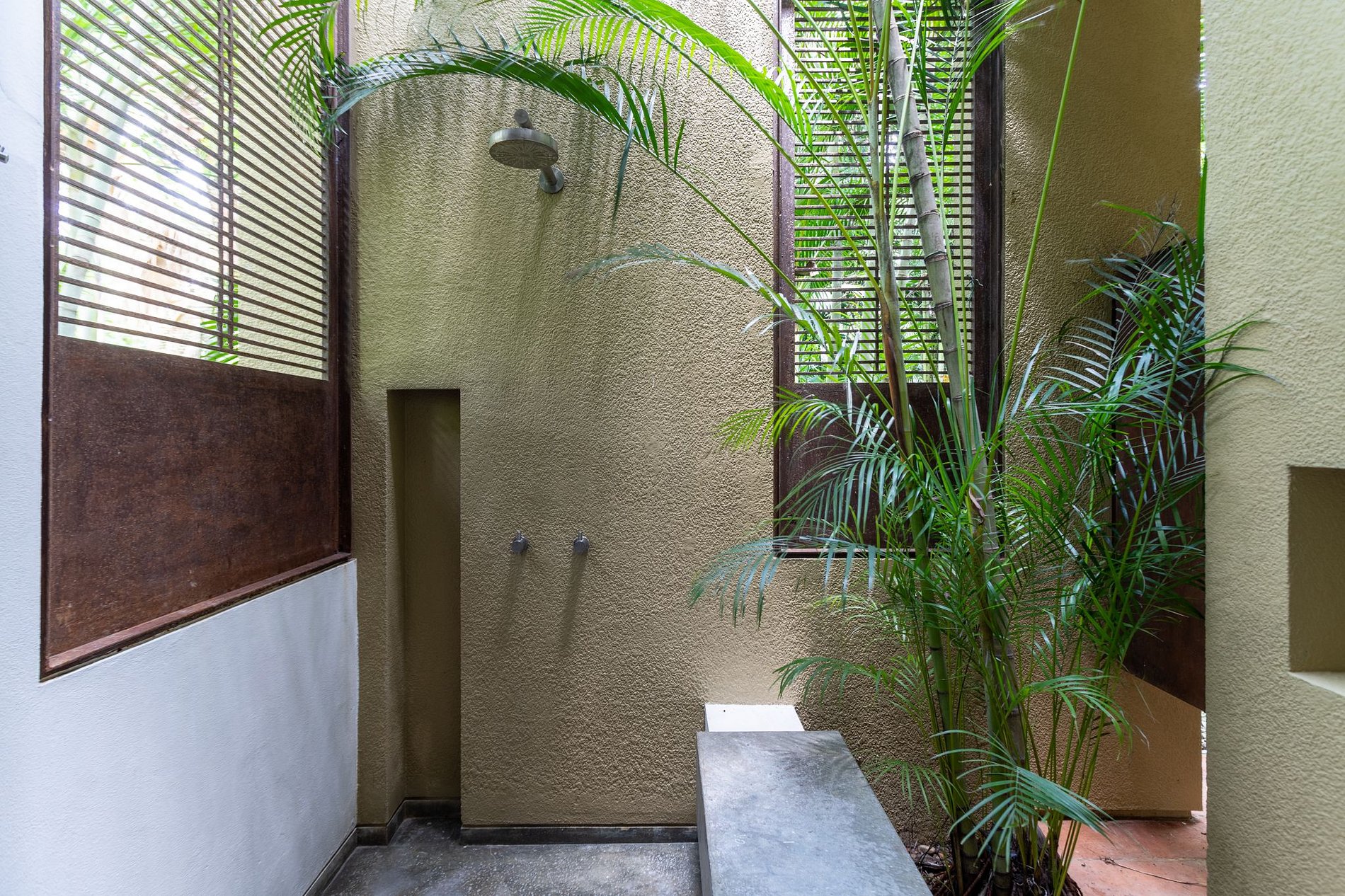 Assim como as outras propriedades da região, esta também conta com elementos arquiteturais que visam refrescar e iluminar a propriedade de forma sustentável durante todo o dia. As áreas sociais são majoritariamente abertas, oferecendo vistas para o jardim e piscina de diversos pontos da propriedade.