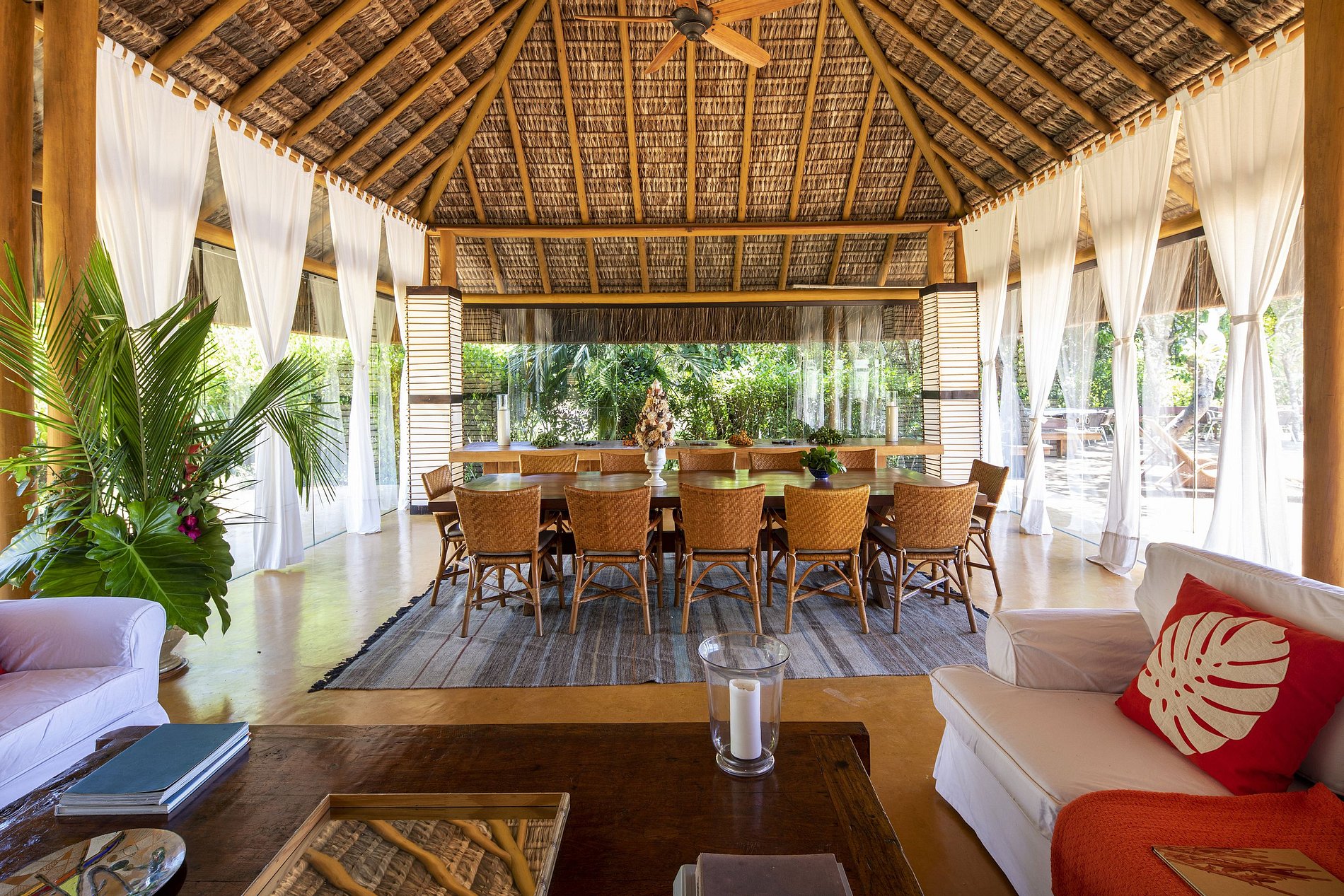 O lounge bar sob o teto de piaçava trançado é o local ideal para desfrutar de uma caipirinha feita na hora enquanto se tem ótimas conversas com seus convidados. O pessoal bem treinado, incluído no preço do aluguel, irá satisfazer todos os desejos que você tem. A propriedade também possui uma enorme sala de 200m2 com mobiliário confortável e equipamento moderno.