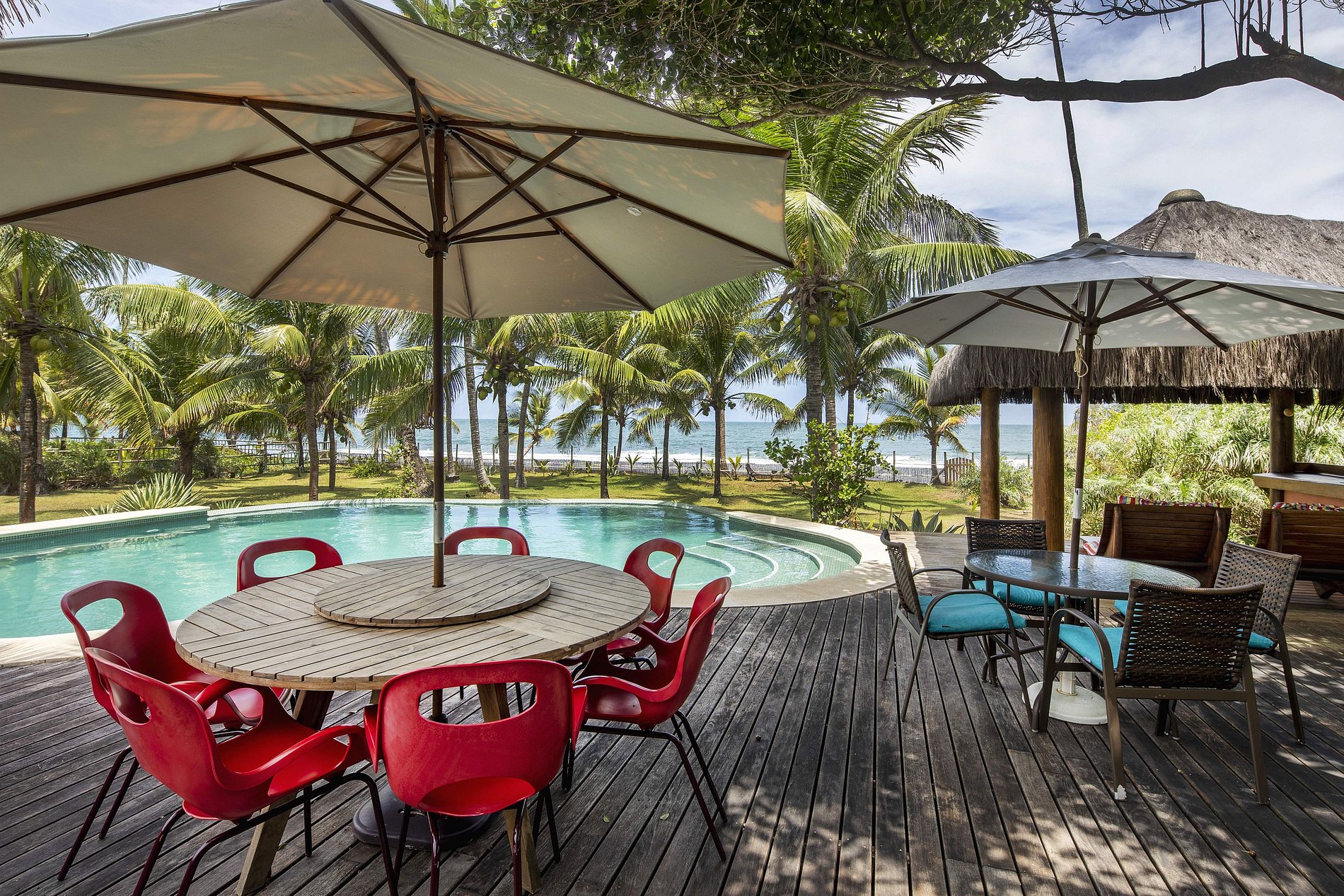A sala arejada possui decorações coloridas, as 2 pérgolas são perfeitas para tomar café, almoçar ou jantar no som do mar, a grande piscina um luxo para se refrescar e nadar.