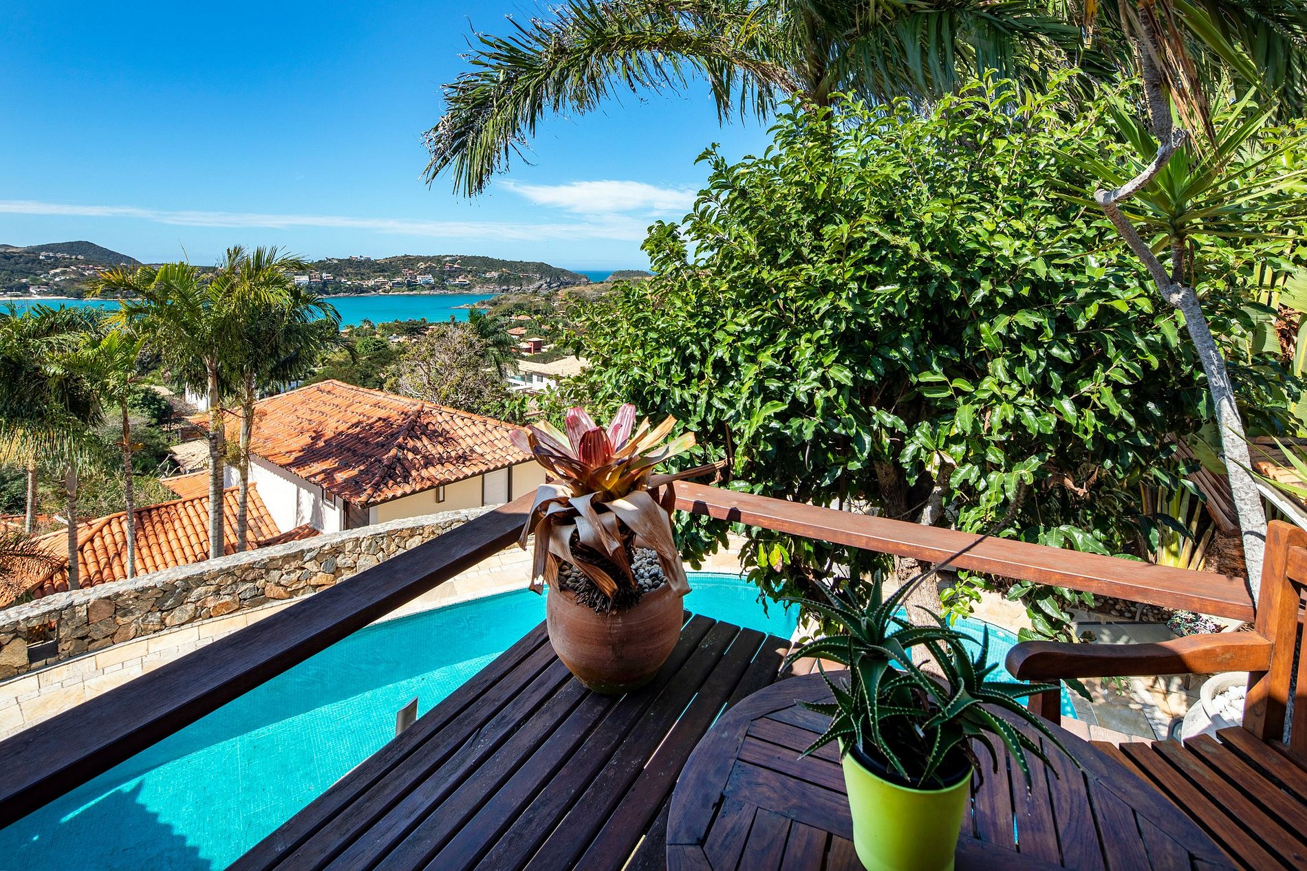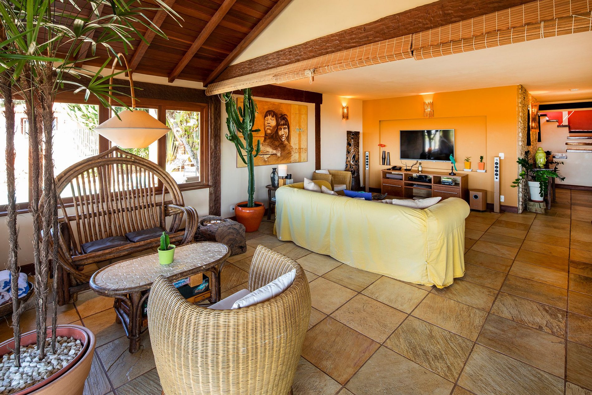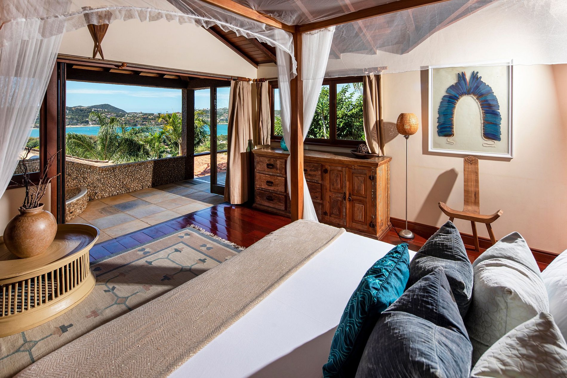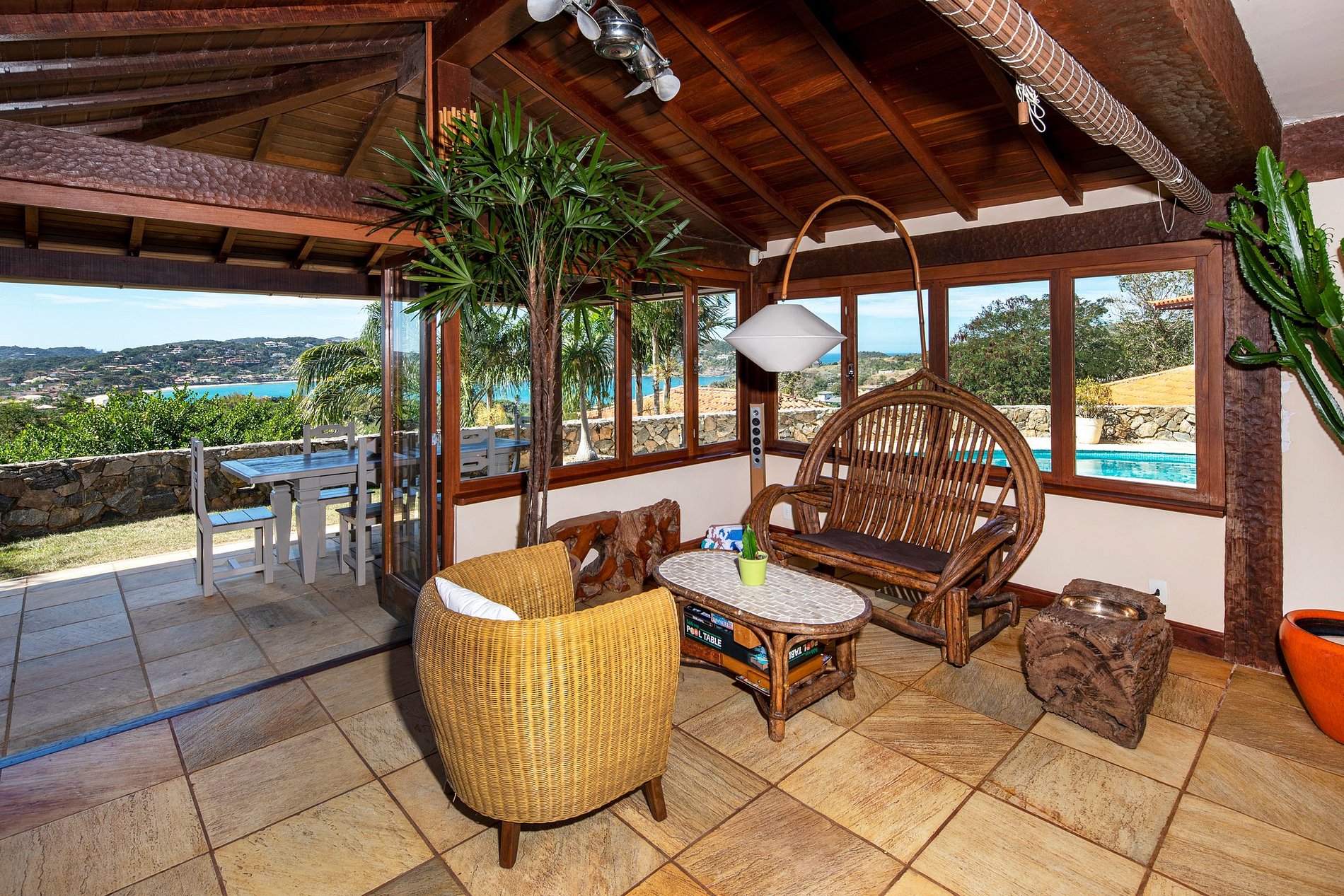 A sala de estar principal está decorada com um estilo tradicional de Búzios com mobiliário em madeira escura ornamentada e piso de azulejos. As amplas portas e janelas aproveitam todas as vistas espetaculares que inundam o interior com a luz solar natural. Você pode ver de uma extremidade da propriedade para a outra e atravessar a Baía.