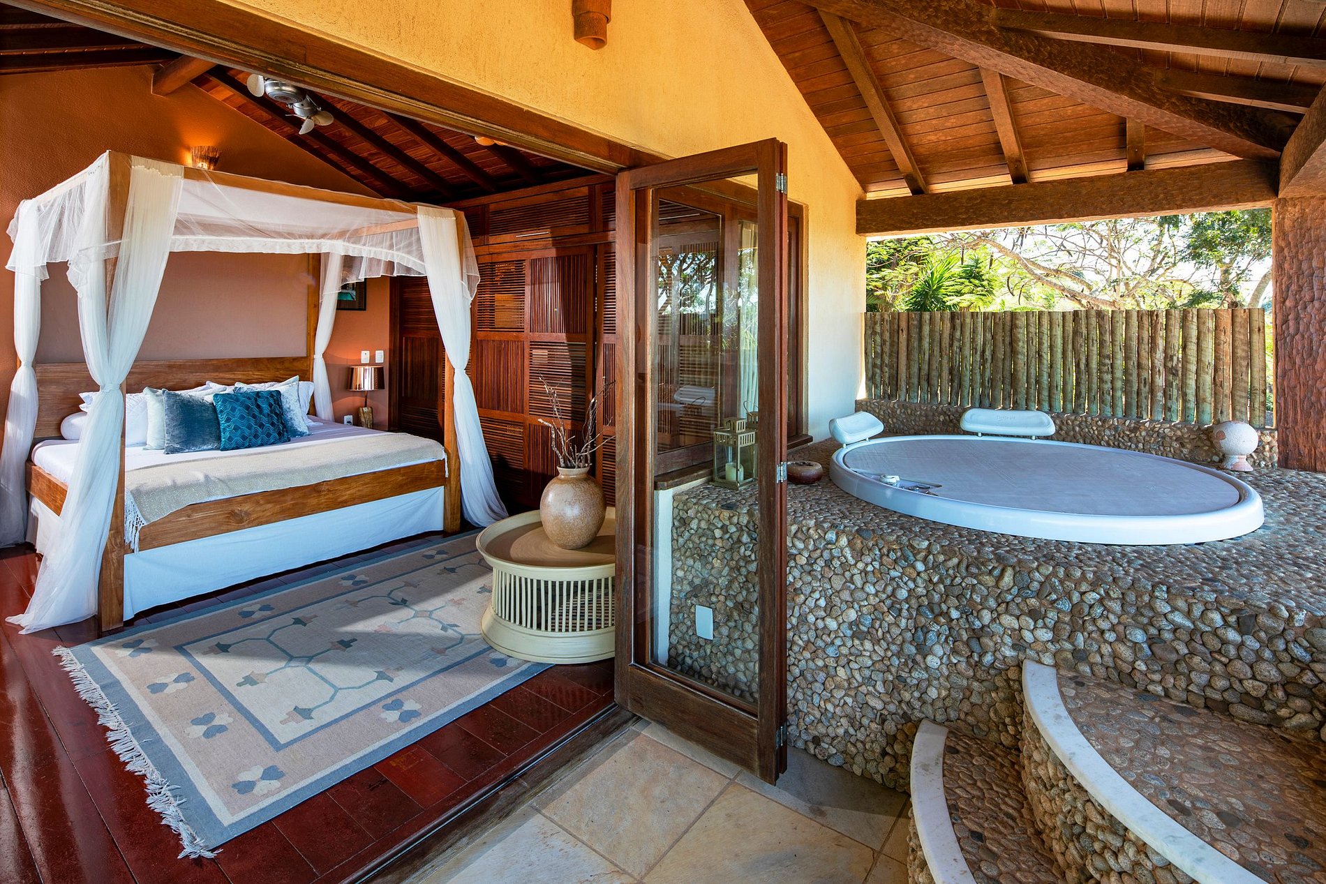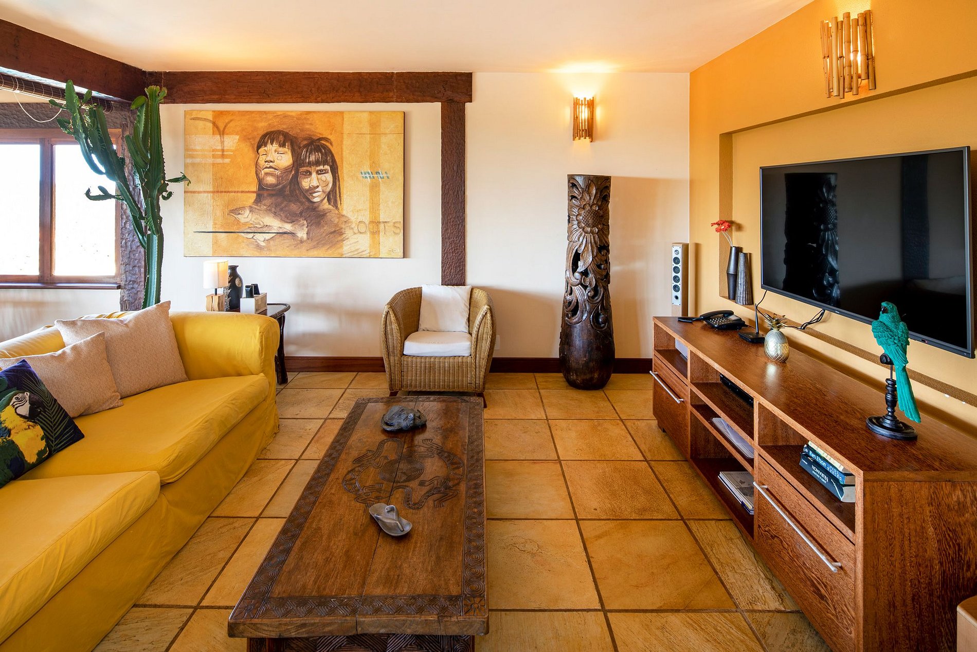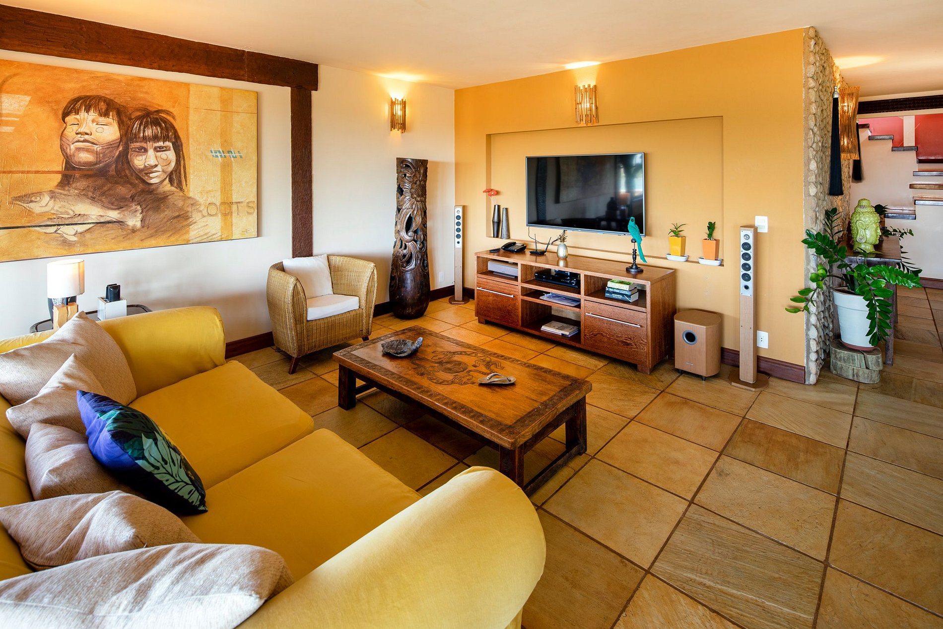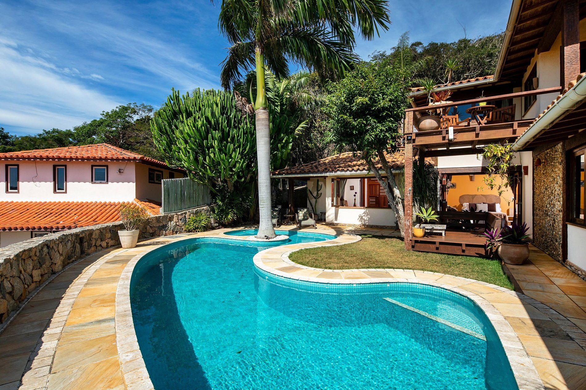 A sala de estar principal está decorada com um estilo tradicional de Búzios com mobiliário em madeira escura ornamentada e piso de azulejos. As amplas portas e janelas aproveitam todas as vistas espetaculares que inundam o interior com a luz solar natural. Você pode ver de uma extremidade da propriedade para a outra e atravessar a Baía.