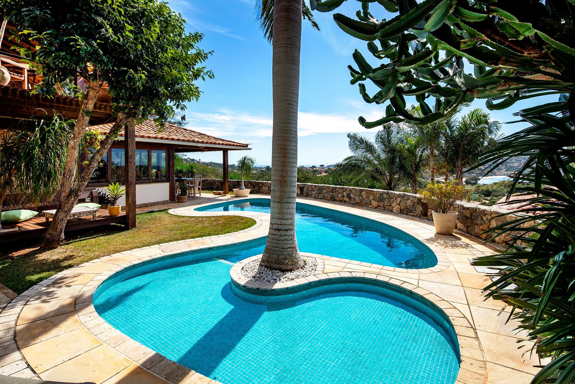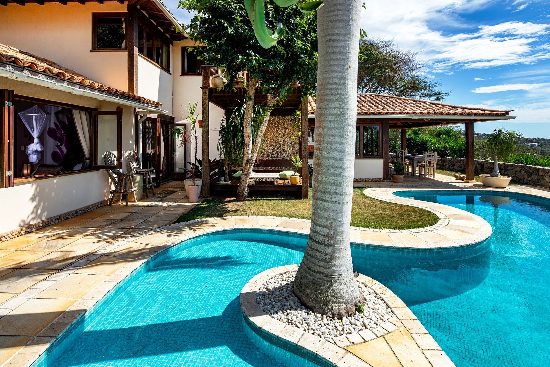 Lá fora, há um jardim bem cuidado e uma piscina tropical que gira em torno de uma ilha de palmeiras. O único lugar que você quer estar durante esses dias de verão quente do Brasil.