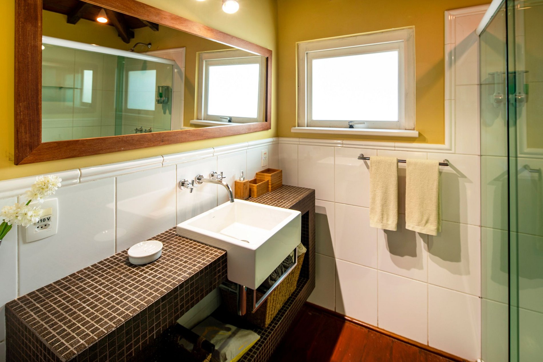 Lá fora, há um jardim bem cuidado e uma piscina tropical que gira em torno de uma ilha de palmeiras. O único lugar que você quer estar durante esses dias de verão quente do Brasil.