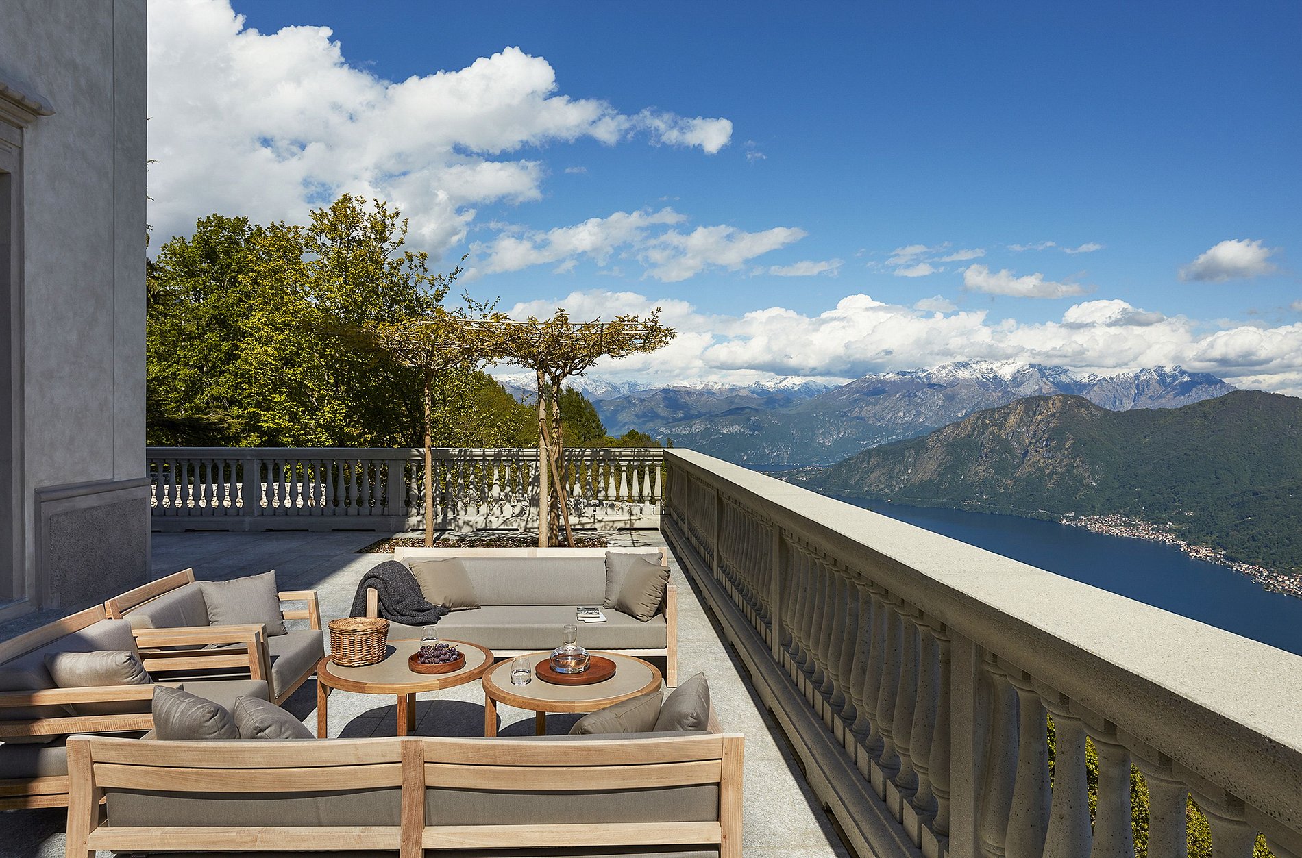 As vistas da Villa voltada para o sul são verdadeiramente deslumbrantes - uma combinação do grande lago azul e as vistas das montanhas verdes arredondadas com gloriosos pores do sol dourados. Estes podem ser apreciados a partir das varandas de cada quarto, do terraço principal ao redor da villa e da extraordinária casa da piscina com seu telhado verde e piscina infinita. Também aproveitando este aspecto está uma sala de ioga/bem-estar excepcional que foi esculpida na falésia e os terraços da cobertura, bar e área de entretenimento.