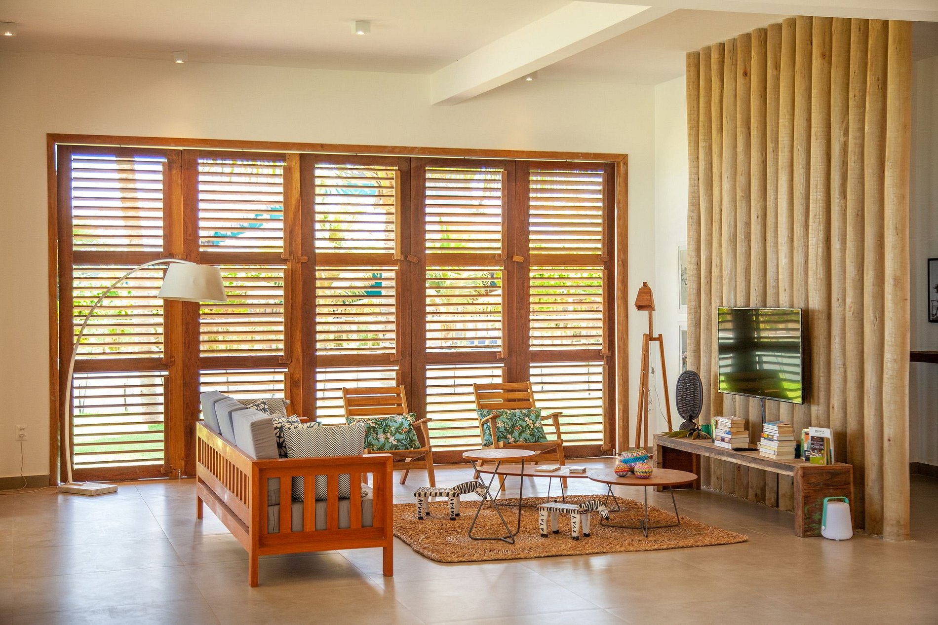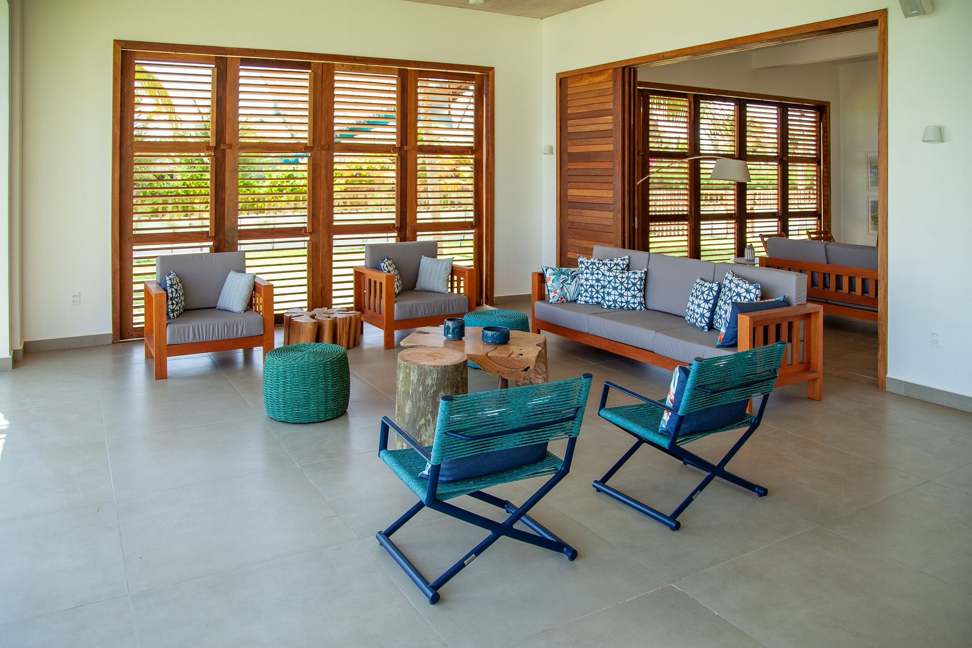 A área externa é um convite ao dolce far niente. Um extenso gramado se estende até a areia, margeado por coqueiros e por uma piscina com deck de madeira, espreguiçadeiras e redes que balançam sob a sombra. Há ainda um terraço com poltronas largas e uma vista 360º que hipnotiza – ideal para o pôr do sol com um drink na mão. Para os mais ativos, a casa oferece uma estrutura perfeita para saída de kitesurf diretamente da propriedade e até uma quadra para beach tennis. E se a ideia for relaxar, que tal uma água de coco no jardim ou um bom livro com o som do mar ao fundo?
