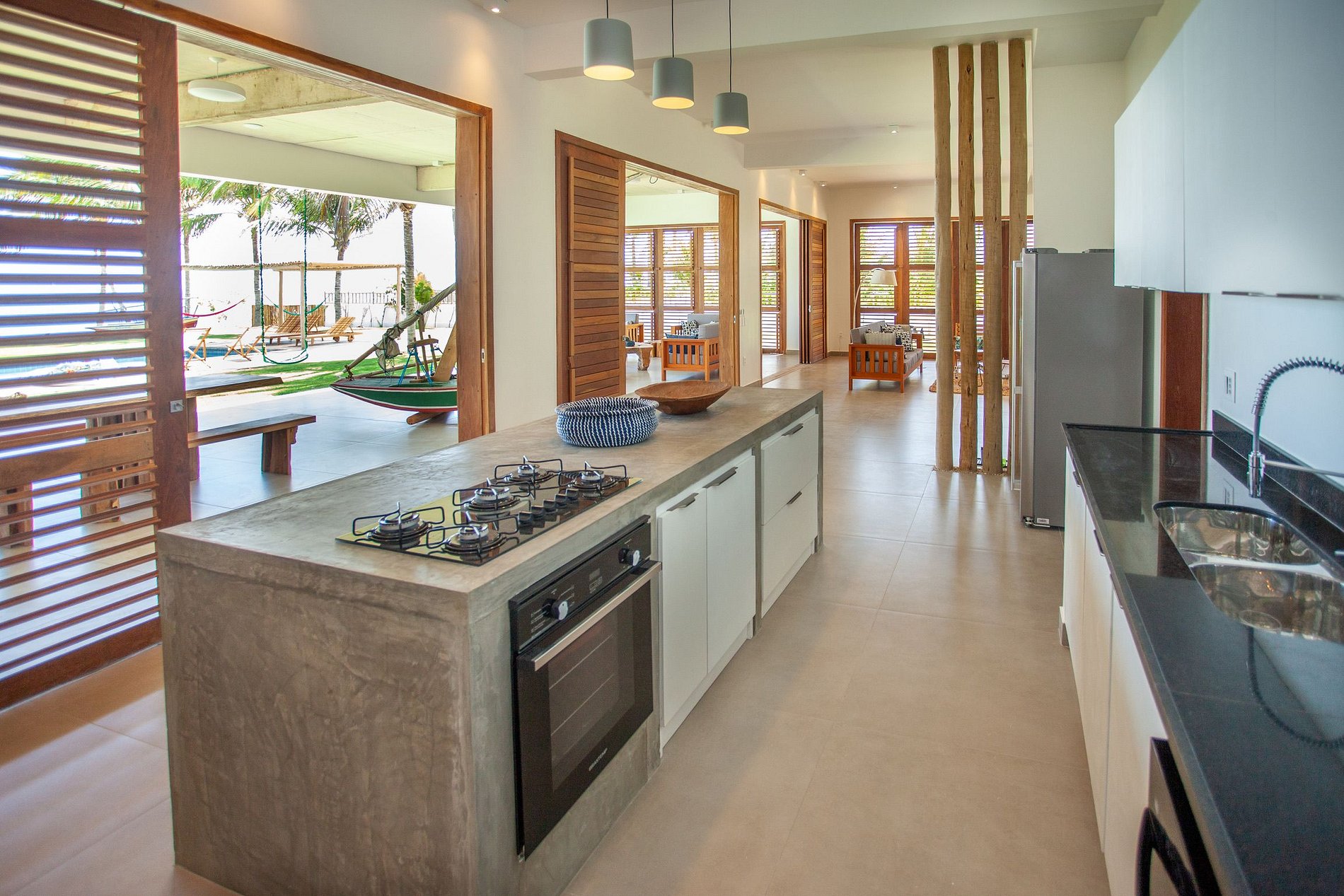 A área externa é um convite ao dolce far niente. Um extenso gramado se estende até a areia, margeado por coqueiros e por uma piscina com deck de madeira, espreguiçadeiras e redes que balançam sob a sombra. Há ainda um terraço com poltronas largas e uma vista 360º que hipnotiza – ideal para o pôr do sol com um drink na mão. Para os mais ativos, a casa oferece uma estrutura perfeita para saída de kitesurf diretamente da propriedade e até uma quadra para beach tennis. E se a ideia for relaxar, que tal uma água de coco no jardim ou um bom livro com o som do mar ao fundo?
