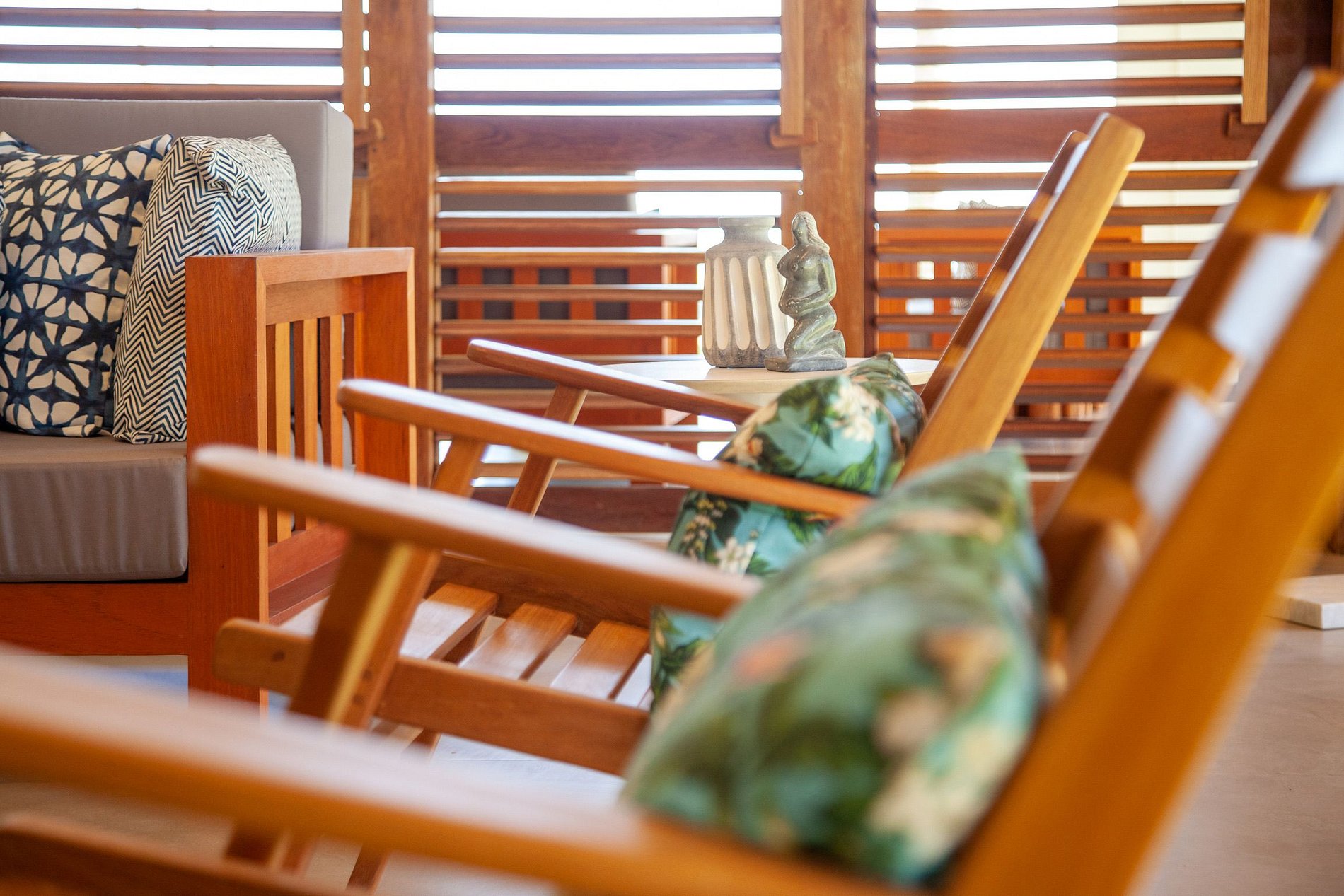 A área externa é um convite ao dolce far niente. Um extenso gramado se estende até a areia, margeado por coqueiros e por uma piscina com deck de madeira, espreguiçadeiras e redes que balançam sob a sombra. Há ainda um terraço com poltronas largas e uma vista 360º que hipnotiza – ideal para o pôr do sol com um drink na mão. Para os mais ativos, a casa oferece uma estrutura perfeita para saída de kitesurf diretamente da propriedade e até uma quadra para beach tennis. E se a ideia for relaxar, que tal uma água de coco no jardim ou um bom livro com o som do mar ao fundo?
