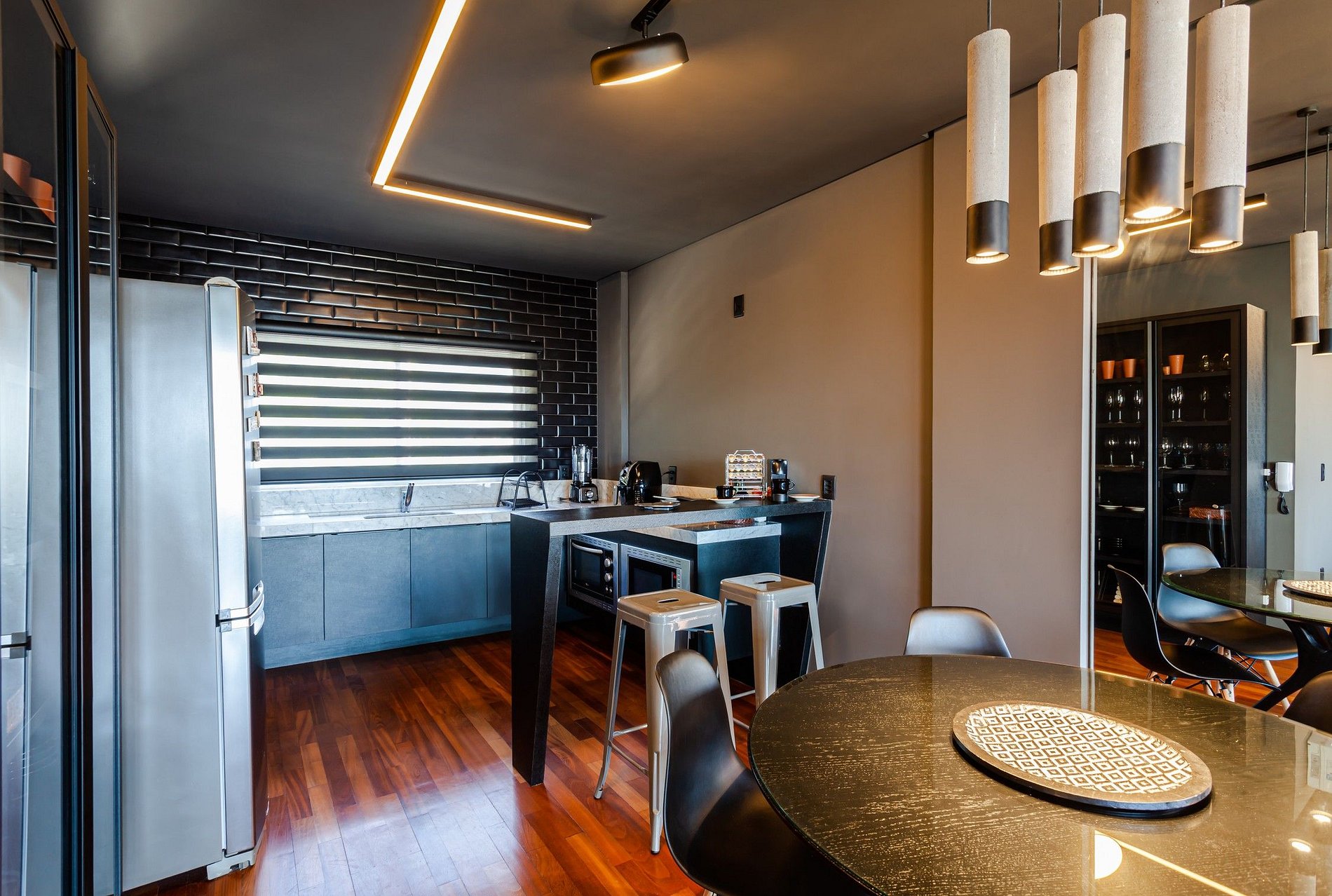 A cozinha possuí um design minimalista e possuí um excelente aproveitamento do espaço com locais pré-definidos para o freezer, fogão, forno e lava louças, bem equipada com todos os itens indispensáveis para o preparo de excelentes refeições. Ao lado da cozinha está a área de serviço sempre pronta para ser usada contendo máquina de lavar e secar, ferro para passar roupa e demais itens.
