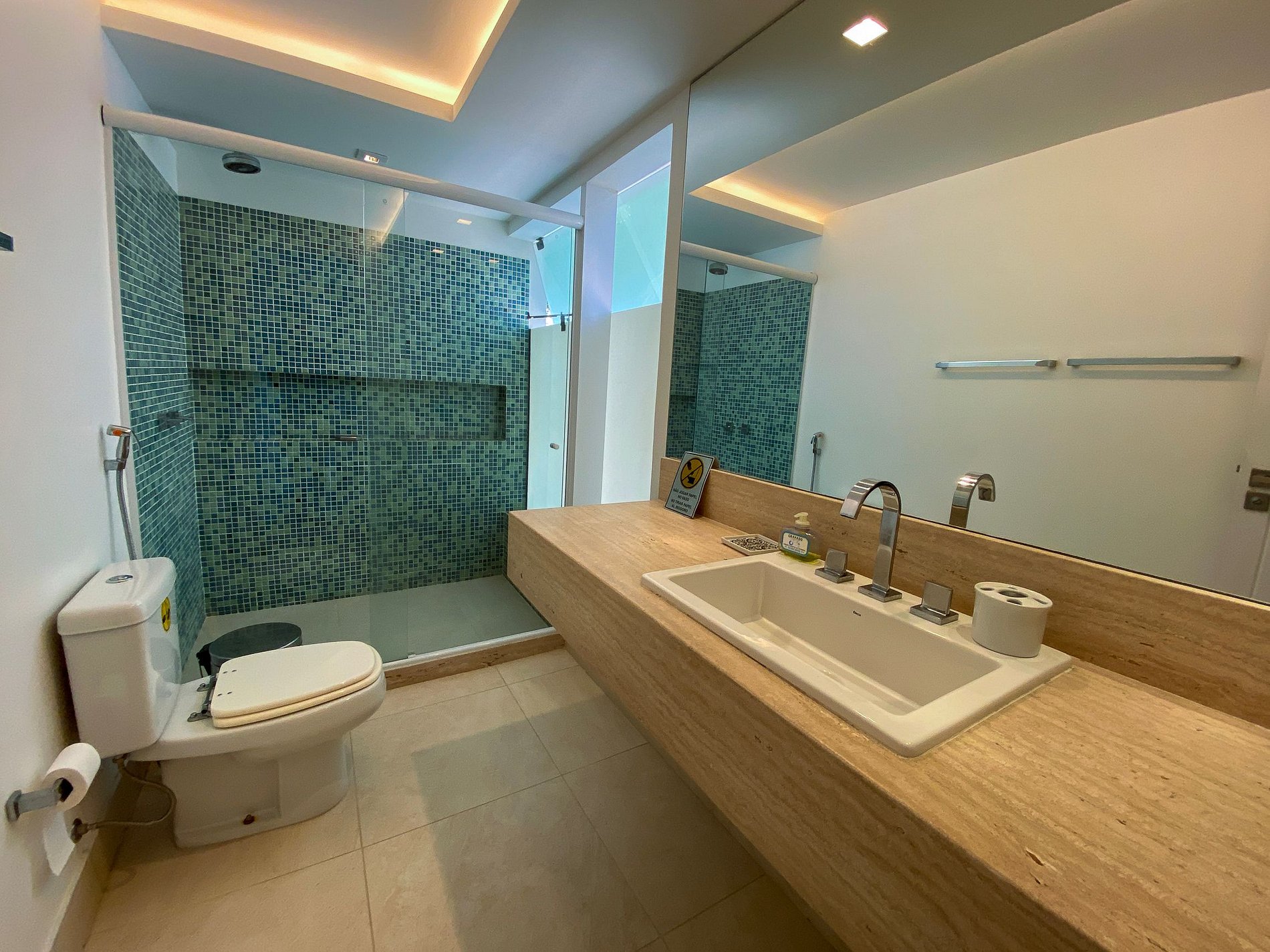 Suíte Master: contem 140m2 com uma sala íntima, varanda, walk-in closet duplo, wc com teto de vidro, banheira e 2 chuveiros italianos Rubinettos com vista total para a praia.