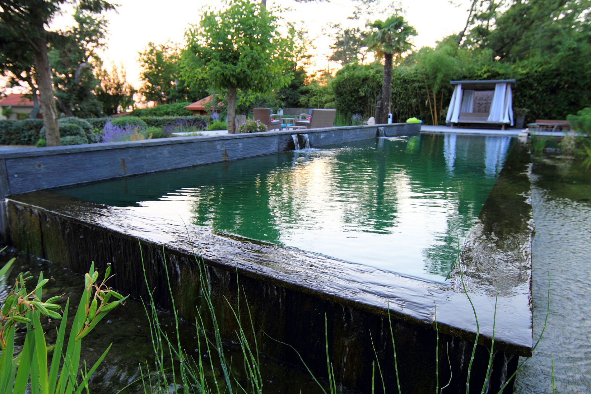 A piscina retangular minimalista de pura fonte natural, com seus tanques naturais de filtragem e regeneração, lembra um verdadeiro lago que se mistura com o jardim. A água da nascente é filtrada e regenerada por meio de plantas, rochas, seixos.